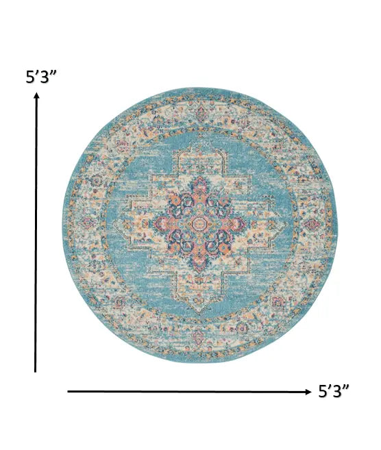 5' Light Blue Round Southwestern Power Loom Area Rug