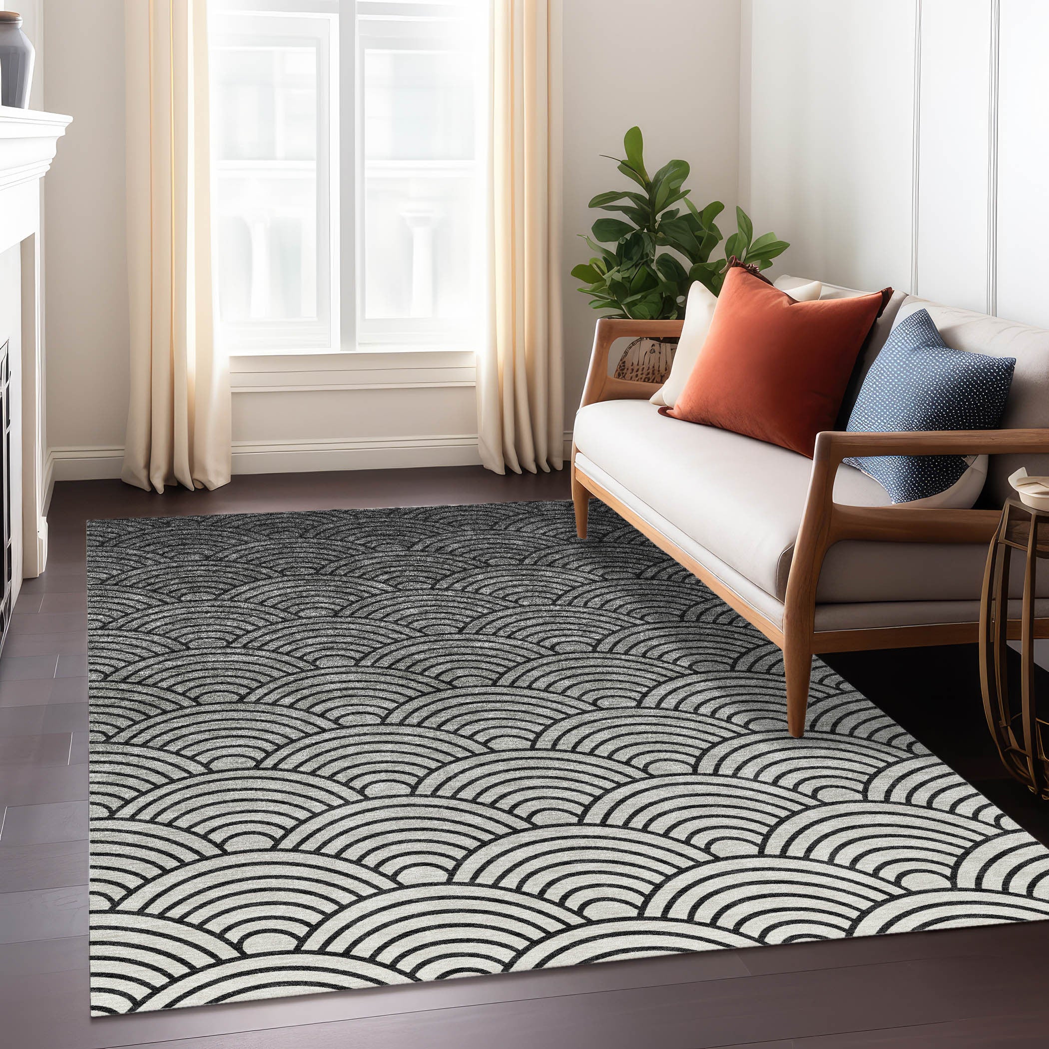 Set an inviting tone in your space with this 5-foot x 8-foot black silver and gray geometric washable indoor outdoor area rug. This rectangle shaped rug features a geometric design that will work well both indoors or out. A classic shape marries with good looking design for your living room, hall, bedroom, porch, patio, or poolside. Ideal for outdoor spaces or high traffic areas with kids and pets, this rug is made from heavy duty polyester that is stain resistant to help repel water, dirt, and stains. Makes a great way to dress up your patio, porch, or poolside, but also works well as a durable and easy to maintain option in the kitchen, family room, or mudroom. 60.00-inch h x 90.00-inch w x 0.19-inch d.
