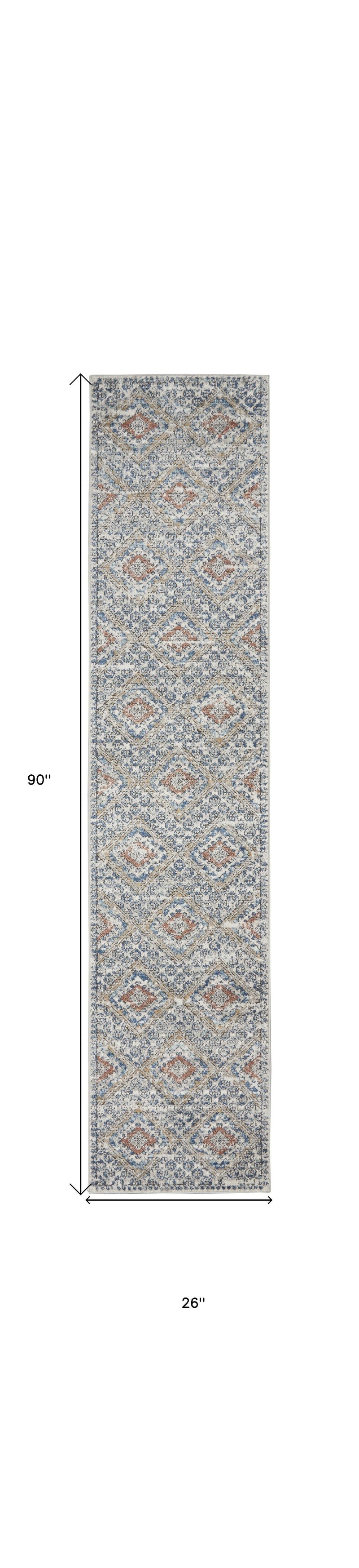 8' Blue And Ivory Southwestern Power Loom Non Skid Runner Rug