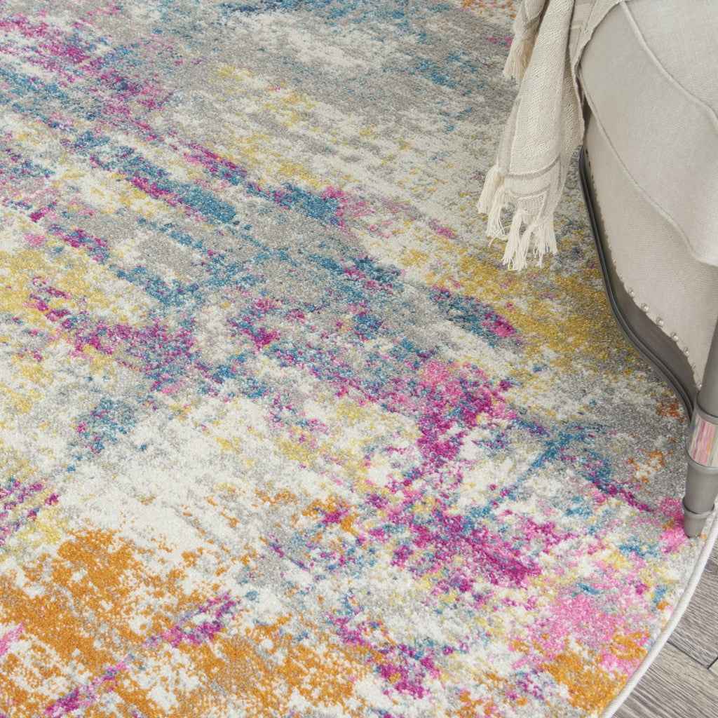 Add great coloration and comfortable texture to your space with this 8' blue and pink round abstract power loom area rug. This geometric round shaped rug features a abstract pattern in blue and pink that combines a good looking print with a unique and updated shape. The mix of shape, color, and design gives this rug refreshing visual interest. This superior Turkish rug represents the highest quality and is built to last. Place this area rug against a hardwood or tile floor and it will enliven your living space with style and sophistication. 1" H x 96" W x 96" D
