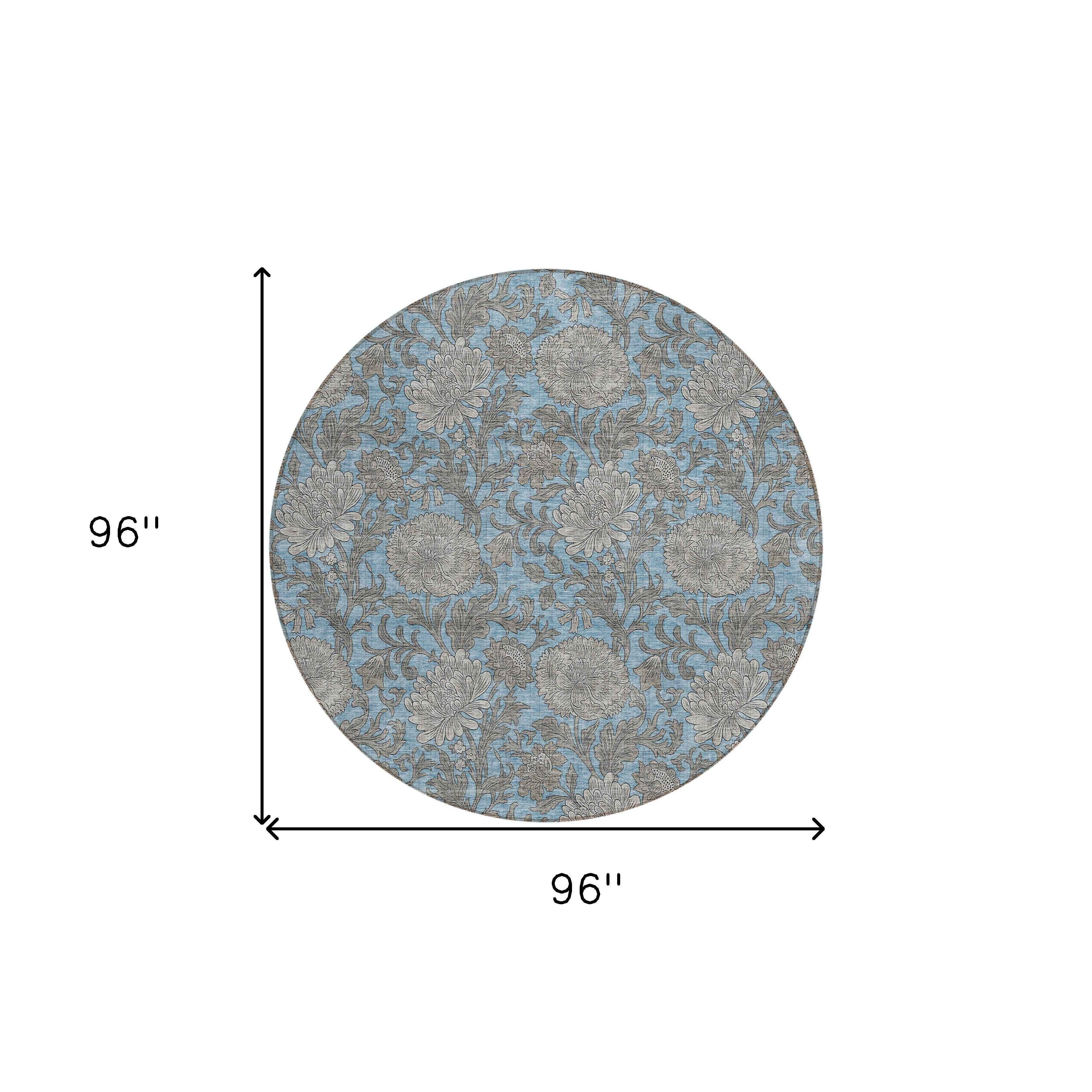 8' Blue Gray And Silver Round Floral Washable Indoor Outdoor Area Rug