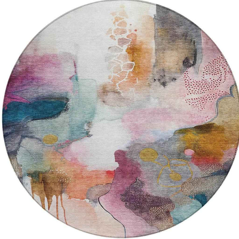 Add some artistry to your room with this 8-foot blush teal blue and ivory round abstract washable indoor outdoor area rug. This geometric round shaped rug features a abstract pattern in blush, teal blue, and ivory that combines a good looking print with a unique and updated shape. The mix of shape, color, and design gives this rug refreshing visual interest. Ideal for outdoor spaces or high traffic areas with kids and pets, this rug is made from heavy duty polyester that is stain resistant to help repel water, dirt, and stains. Versatile in use, durable, and easy to maintain, this rug is an ideal solution to add a decorative and inviting touch to your indoor or outdoor space. 96-inch h x 96-inch w x 0.19-inch d.