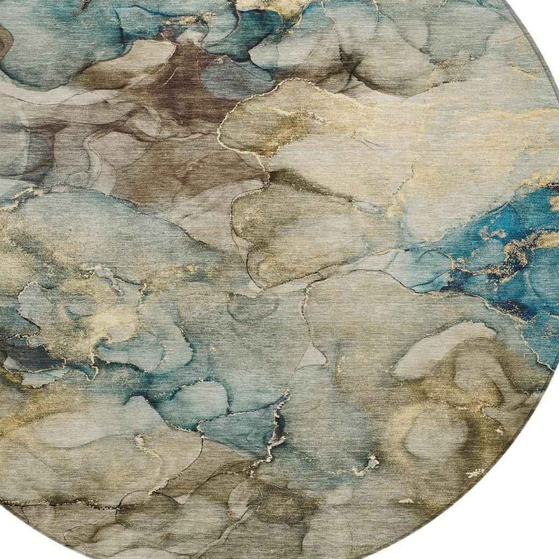 8' Brown And Teal Blue Round Abstract Washable Indoor Outdoor Area Rug