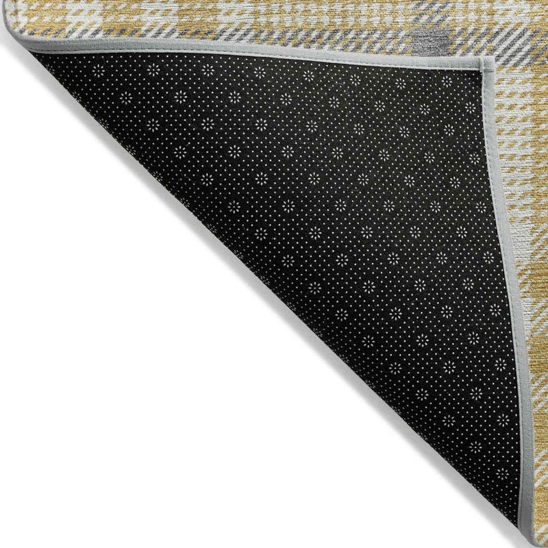 This 8-foot gold gray and beige round plaid washable indoor outdoor area rug, is a great way to add warmth to a room. This geometric round shaped rug features a plaid pattern in gold, gray, and beige that combines a good looking print with a unique and updated shape. The mix of shape, color, and design gives this rug refreshing visual interest. Ideal for outdoor spaces or high traffic areas with kids and pets, this rug is made from heavy duty polyester that is stain resistant to help repel water, dirt, and stains. Makes a great way to dress up your patio, porch, or poolside, but also works well as a durable and easy to maintain option in the kitchen, family room, or mudroom. 96-inch h x 96-inch w x 0.19-inch d.