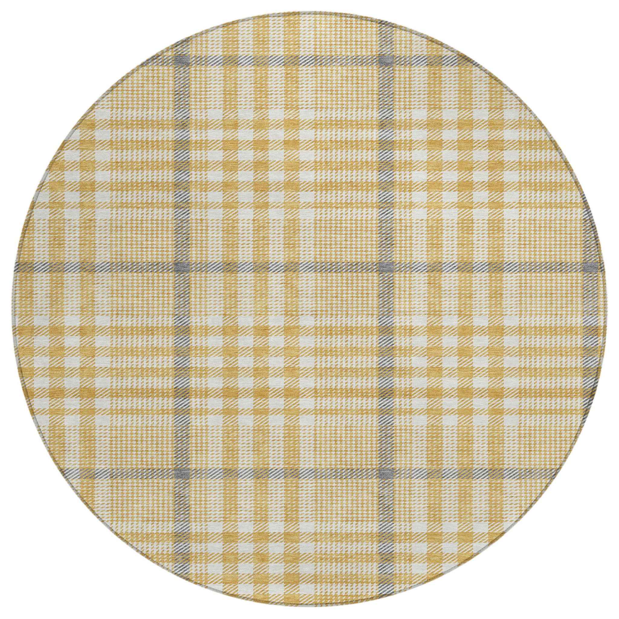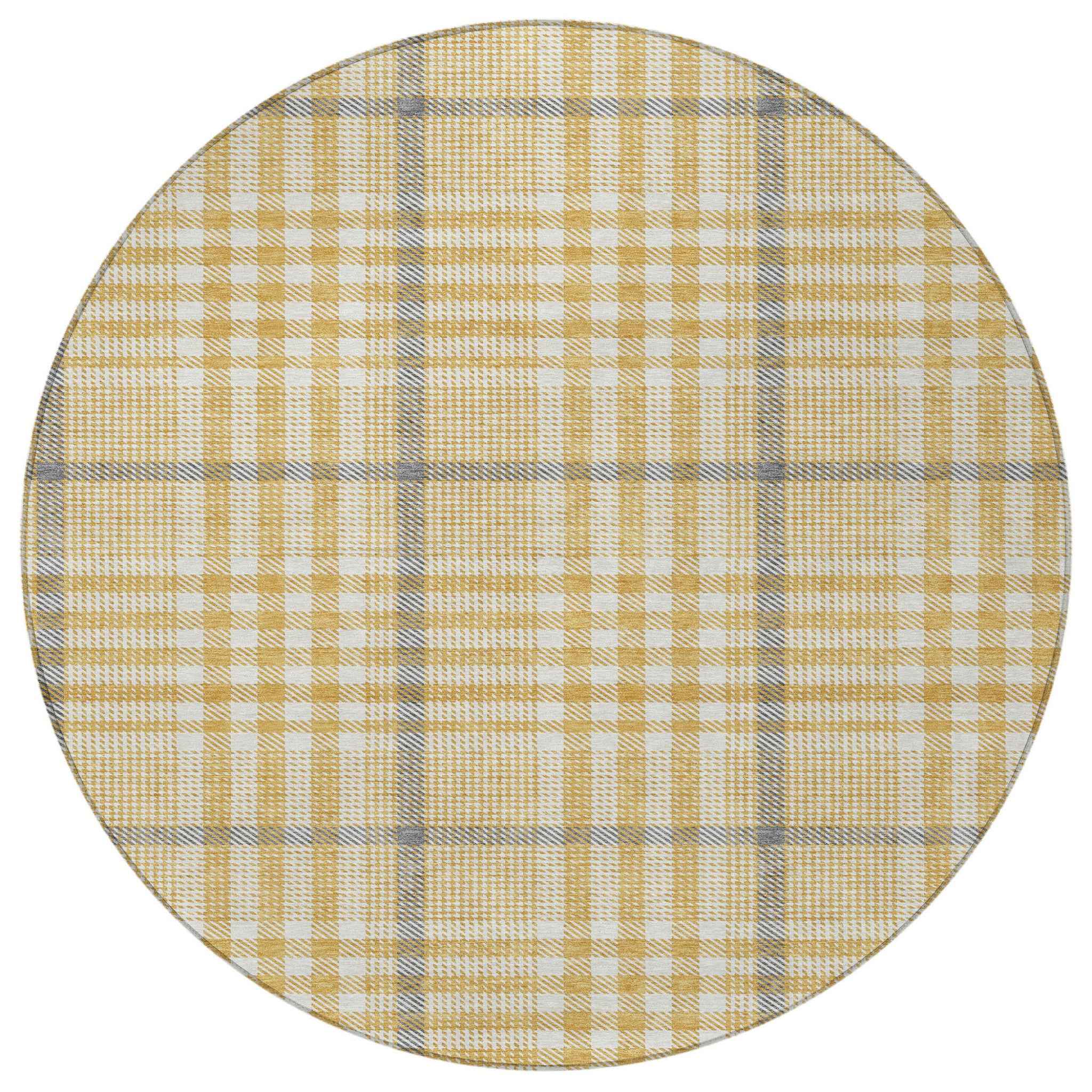 8' Gold Gray And Beige Round Plaid Washable Indoor Outdoor Area Rug