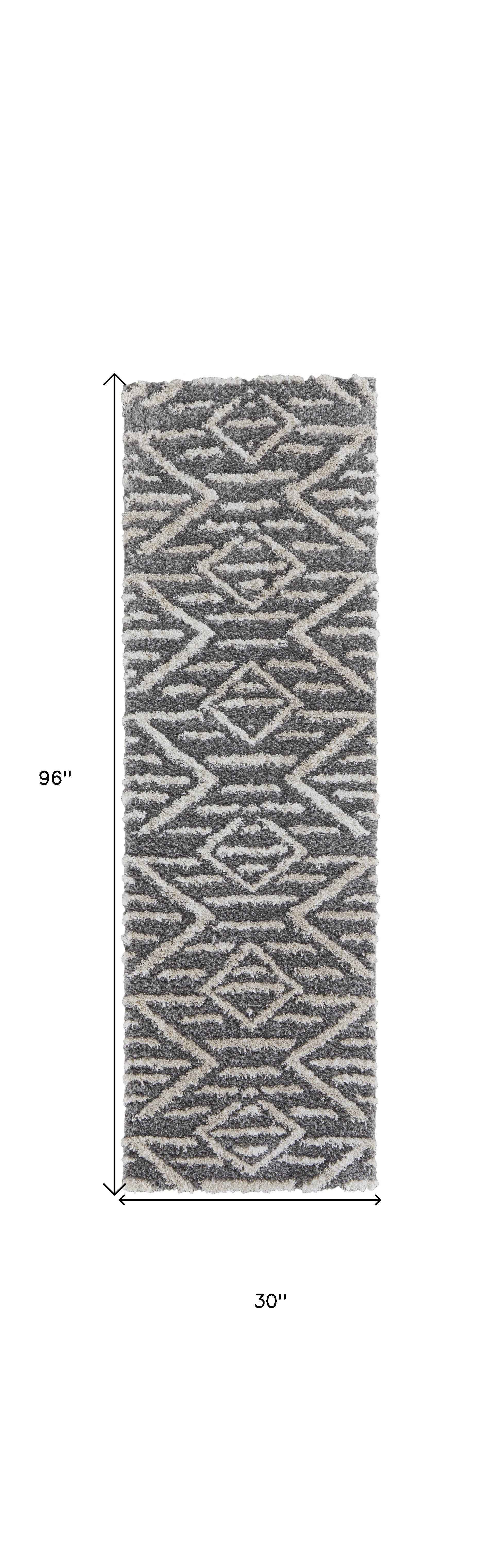 8' Gray And Ivory Geometric Power Loom Stain Resistant Runner Rug