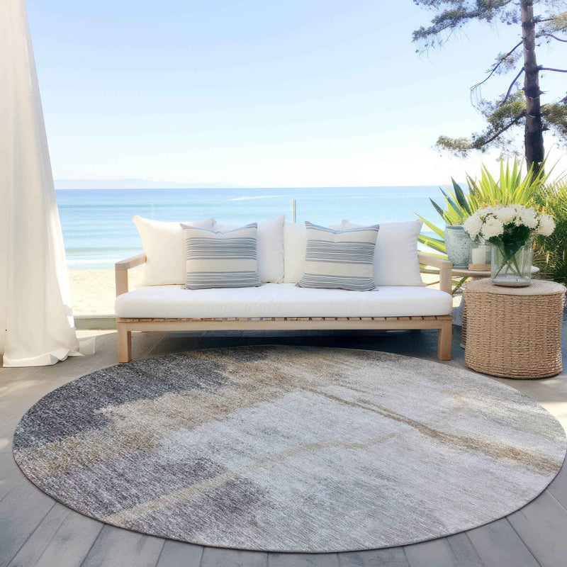 Add some artistry to your room with this 8-foot gray charcoal and beige round abstract washable indoor outdoor area rug. This geometric round shaped rug features a abstract pattern in gray, charcoal, and beige that combines a good looking print with a unique and updated shape. The mix of shape, color, and design gives this rug refreshing visual interest. Ideal for outdoor spaces or high traffic areas with kids and pets, this rug is made from heavy duty polyester that is stain resistant to help repel water, dirt, and stains. Makes a great way to dress up your patio, porch, or poolside, but also works well as a durable and easy to maintain option in the kitchen, family room, or mudroom. 96-inch h x 96-inch w x 0.19-inch d.