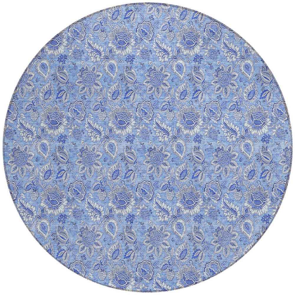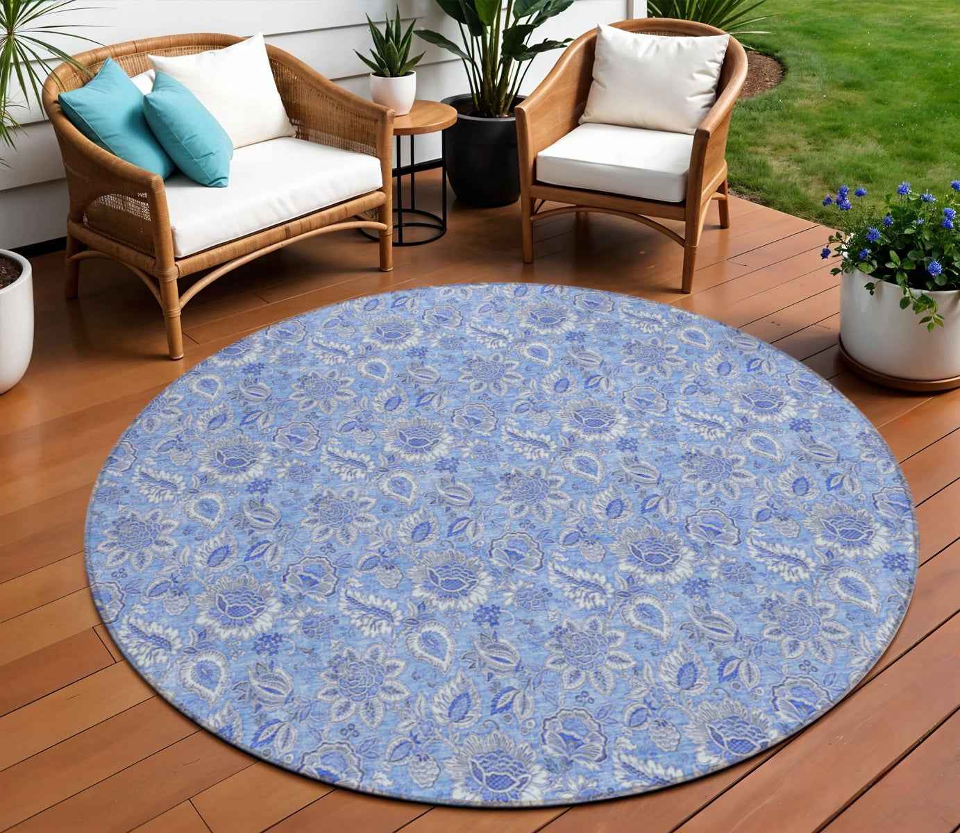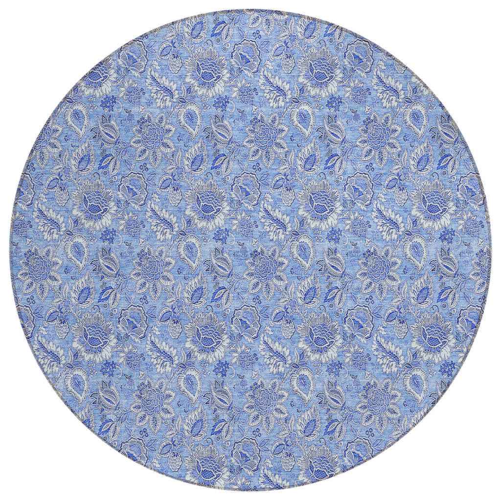 8' Navy Blue And Denim Blue Round Floral Washable Indoor Outdoor Area Rug