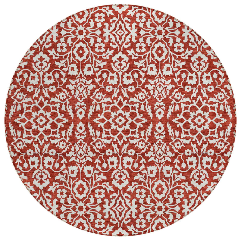 8' Red And Ivory Round Damask Washable Indoor Outdoor Area Rug