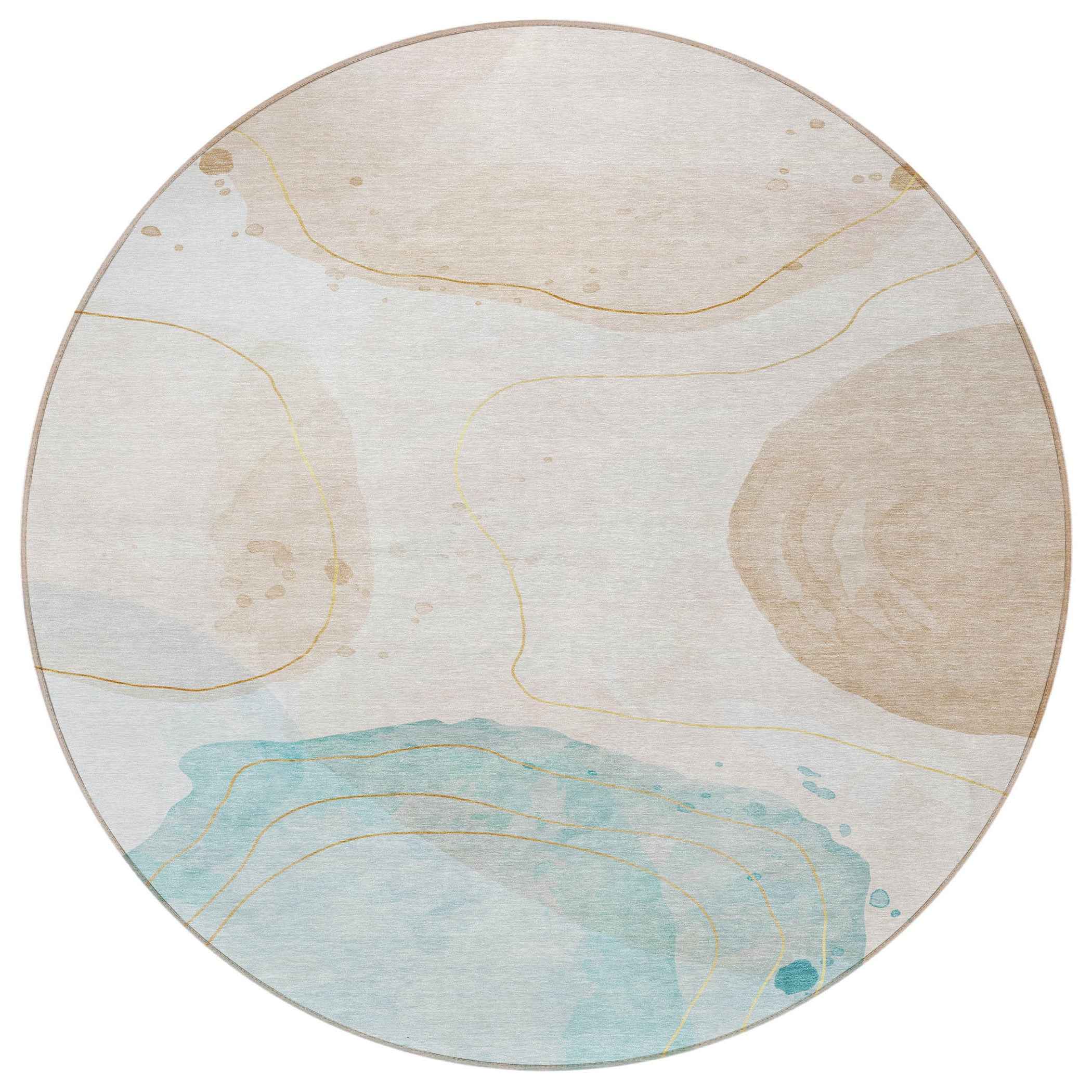 8' Round Beige and Blue Round Abstract Washable Non Skid Indoor Outdoor Area Rug