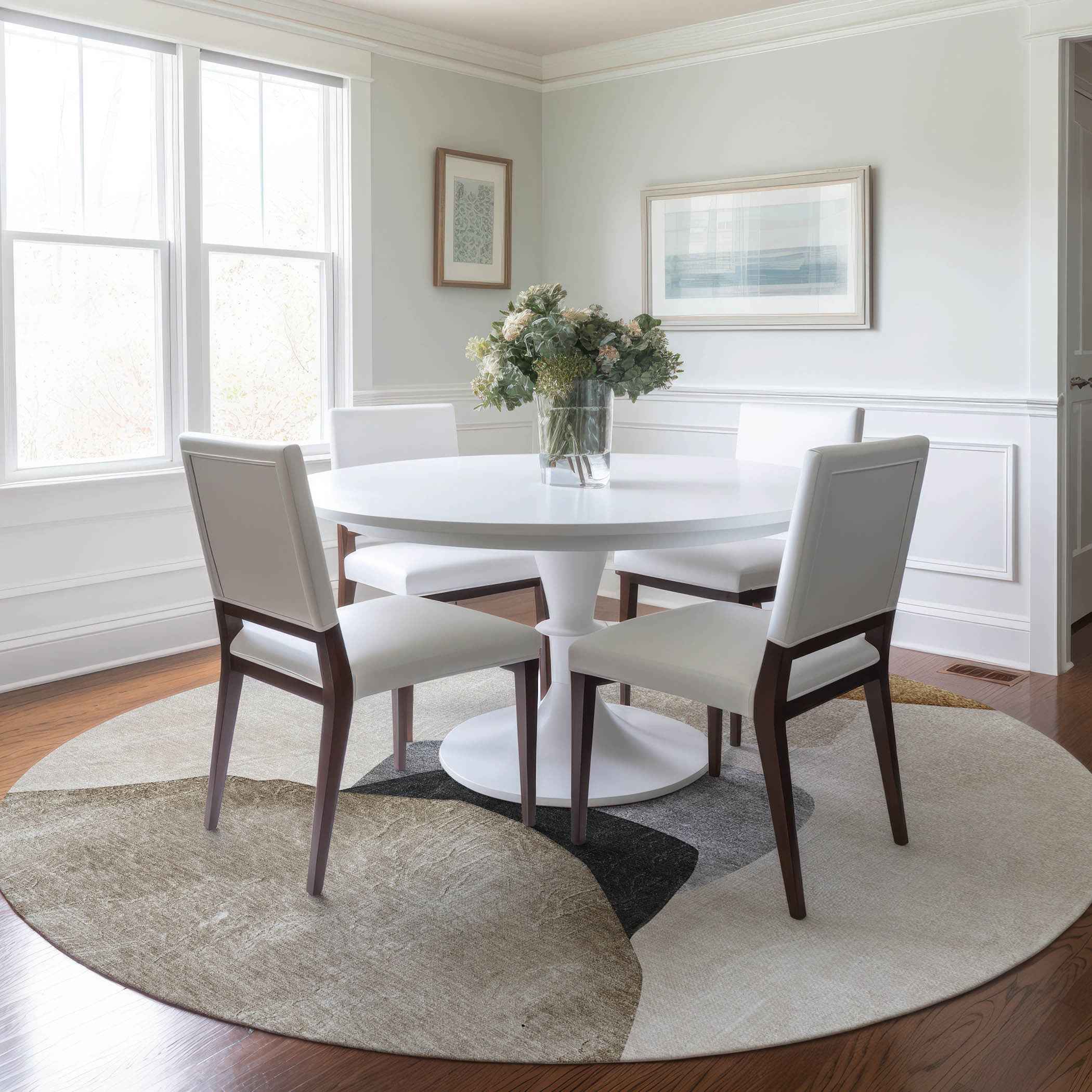 Add some artistry to your room with this 8-foot round tan brown and gray round abstract washable stain resistant non skid indoor outdoor area rug. This geometric round shaped rug features a abstract pattern in tan brown and gray that combines a good looking print with a unique and updated shape. The mix of shape, color, and design gives this rug refreshing visual interest. Ideal for spaces with kids and pets, this rug is stain resistant to help repel stains and spilled liquids. Place this area rug against a hardwood or tile floor and it will enliven your living space with style and sophistication. 96-inch H x 96-inch W x 0.19-inch D