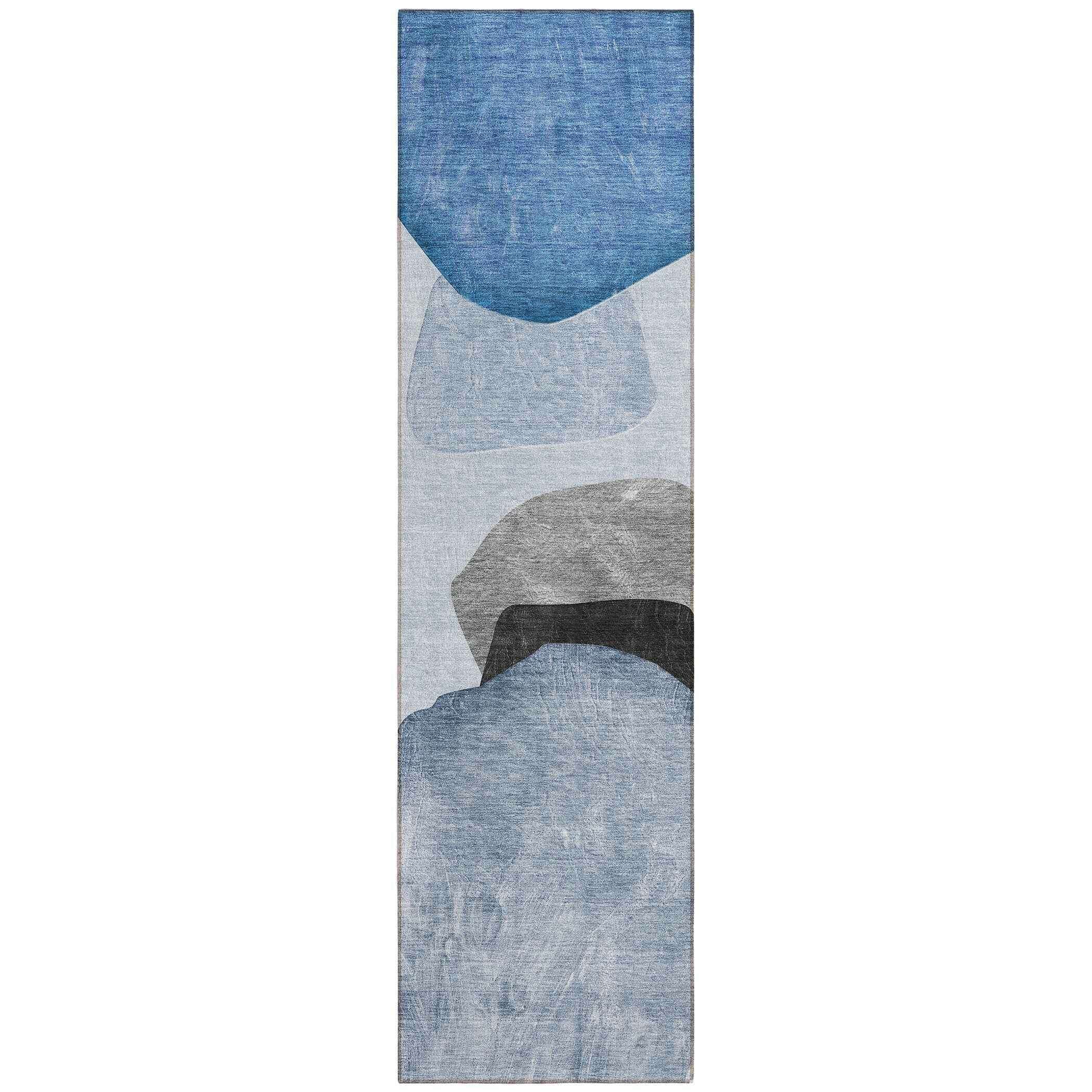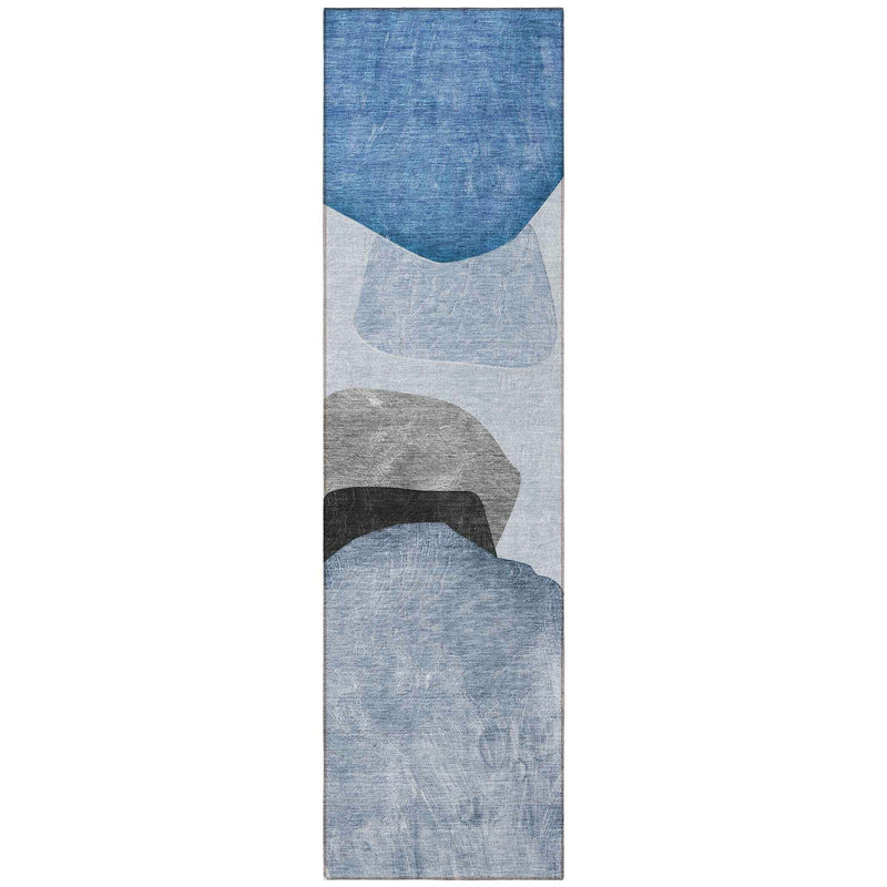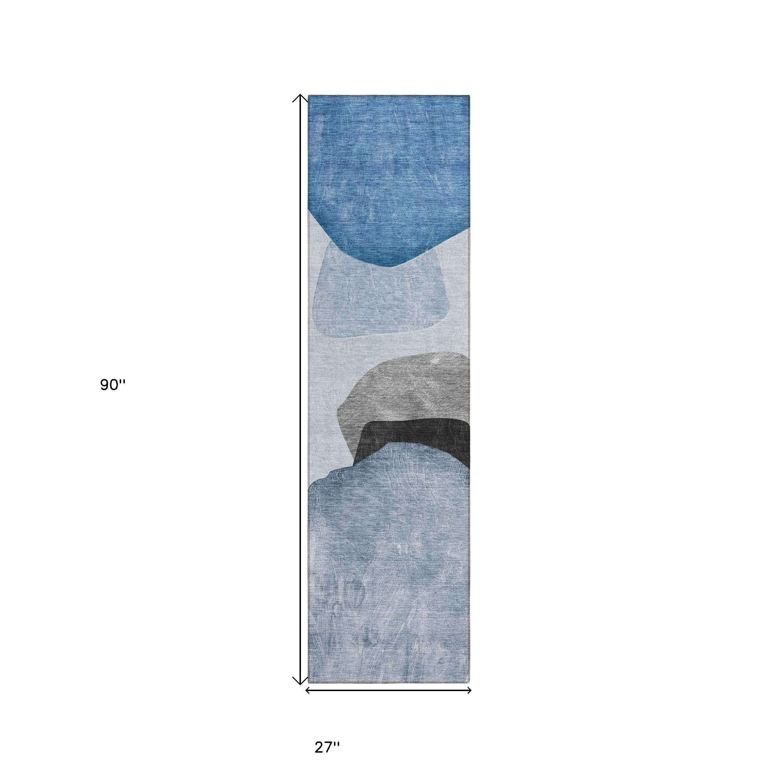 8' Runner Blue Gray and Black Abstract Washable Non Skid Indoor Outdoor Runner Rug