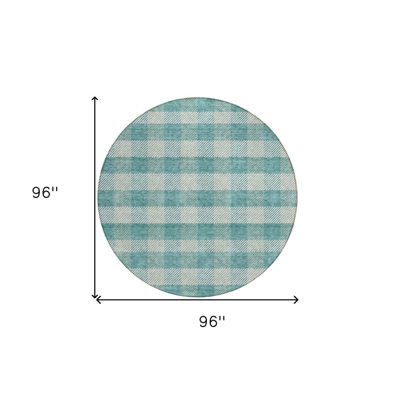8' Teal Blue And Ivory Round Plaid Washable Indoor Outdoor Area Rug