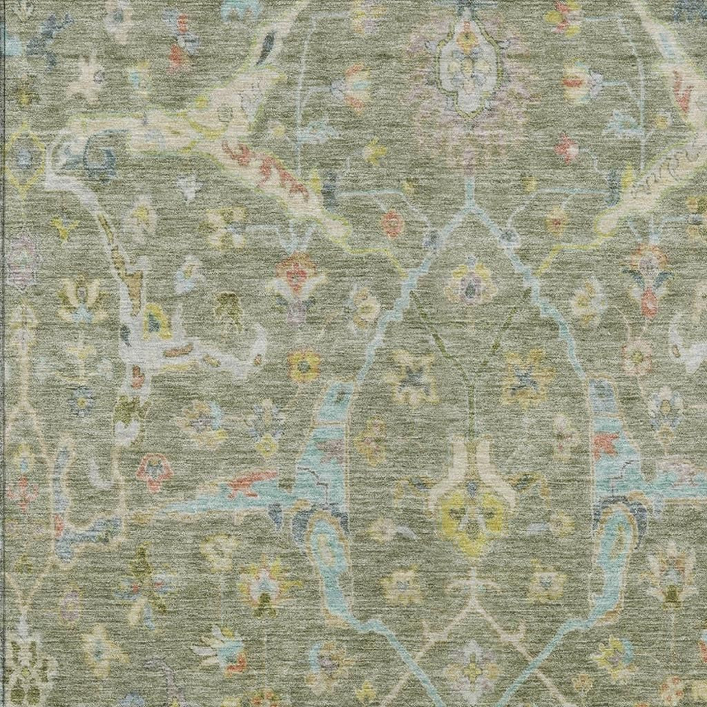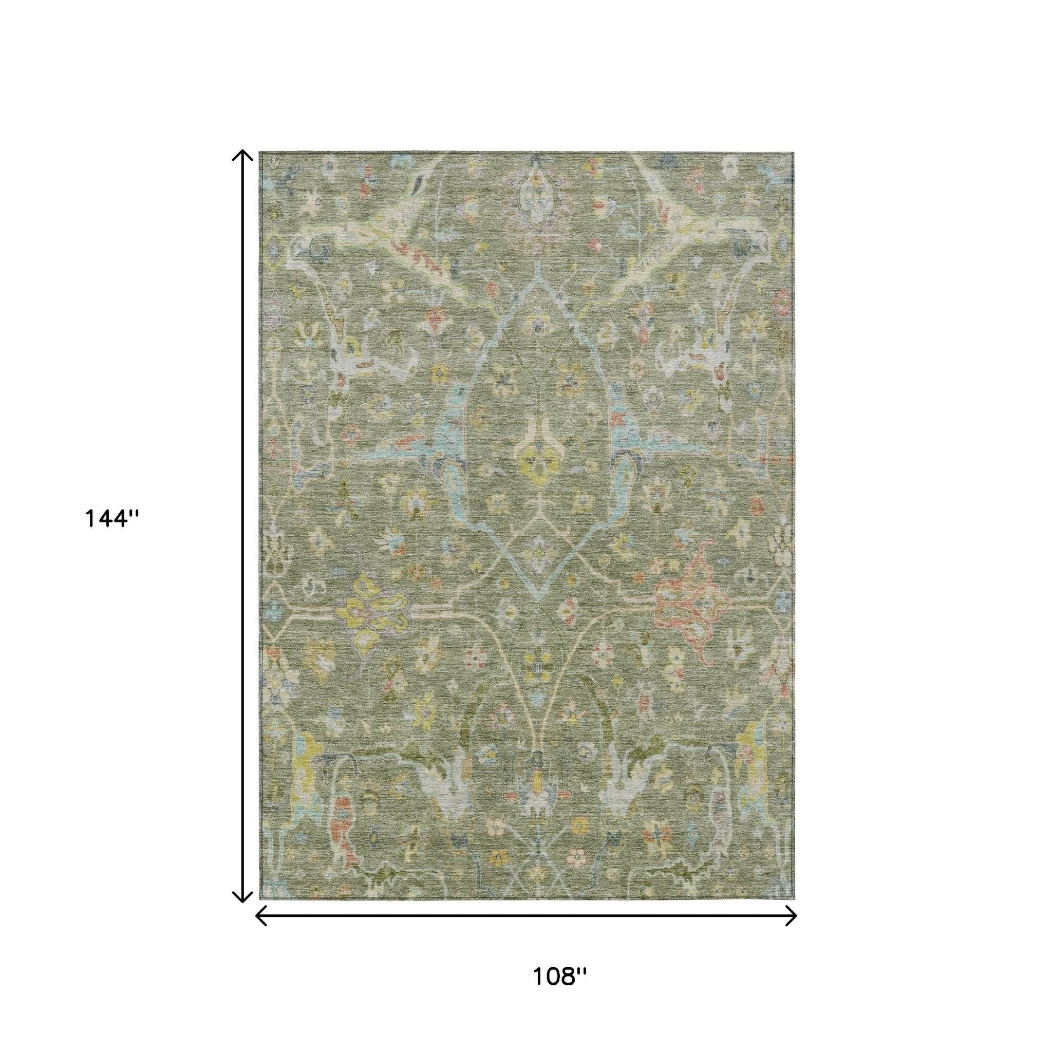 9' X 12' Artichoke Green Gold And Copper Floral Washable Indoor Outdoor Area Rug