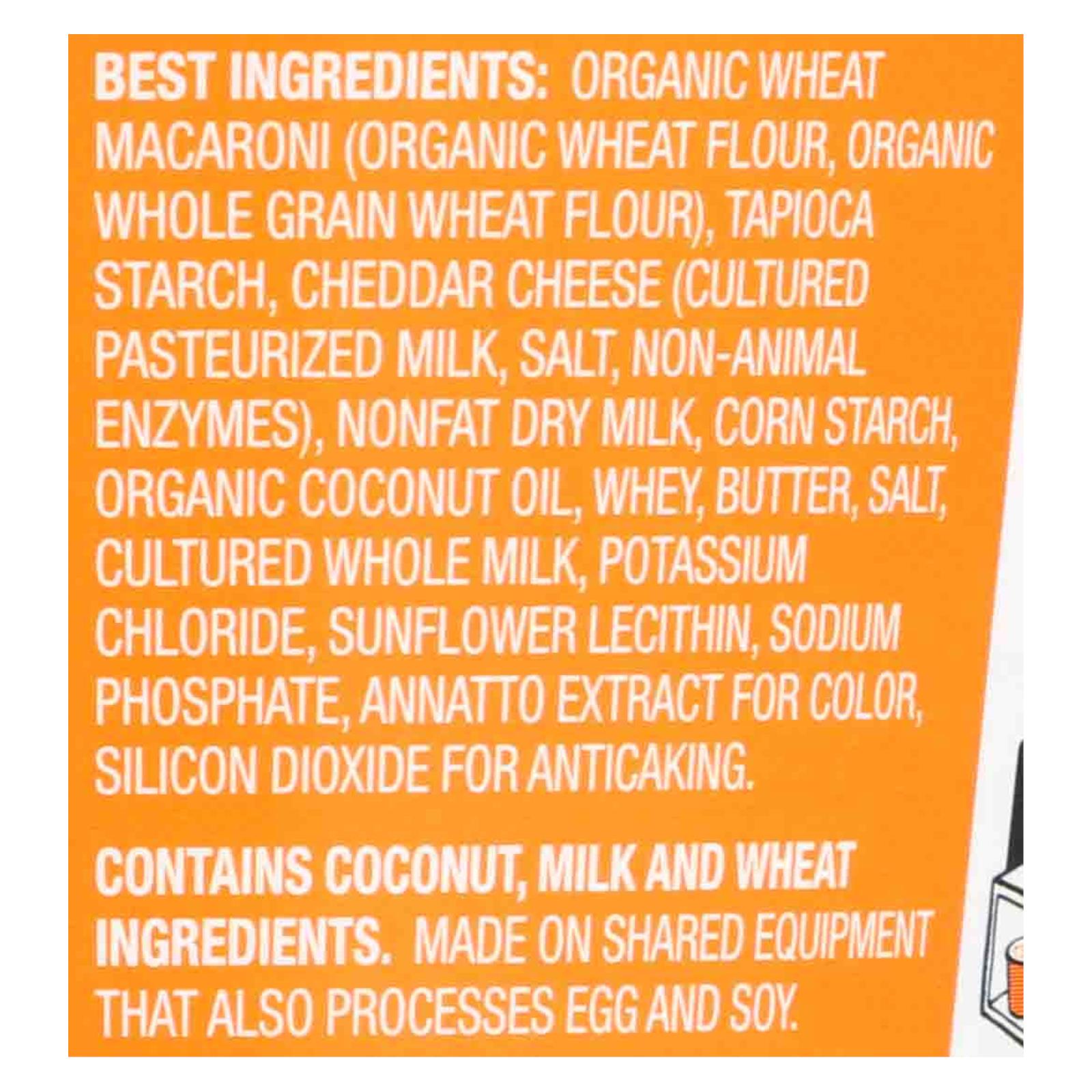 ingredients : organic wheat macaroni;organic wheat flour;organic whole grain wheat flour;tapioca starch;cheddar cheese;cultured pasteurized milk;salt;non-animal enzymes;nonfat dry milk corn starch;organic coconut oil;whey butter;cultured whole milk;potassium chloride;sunflower lecithin;soon phosphate;annatto extract for color;silicon dioxide for anticaking
