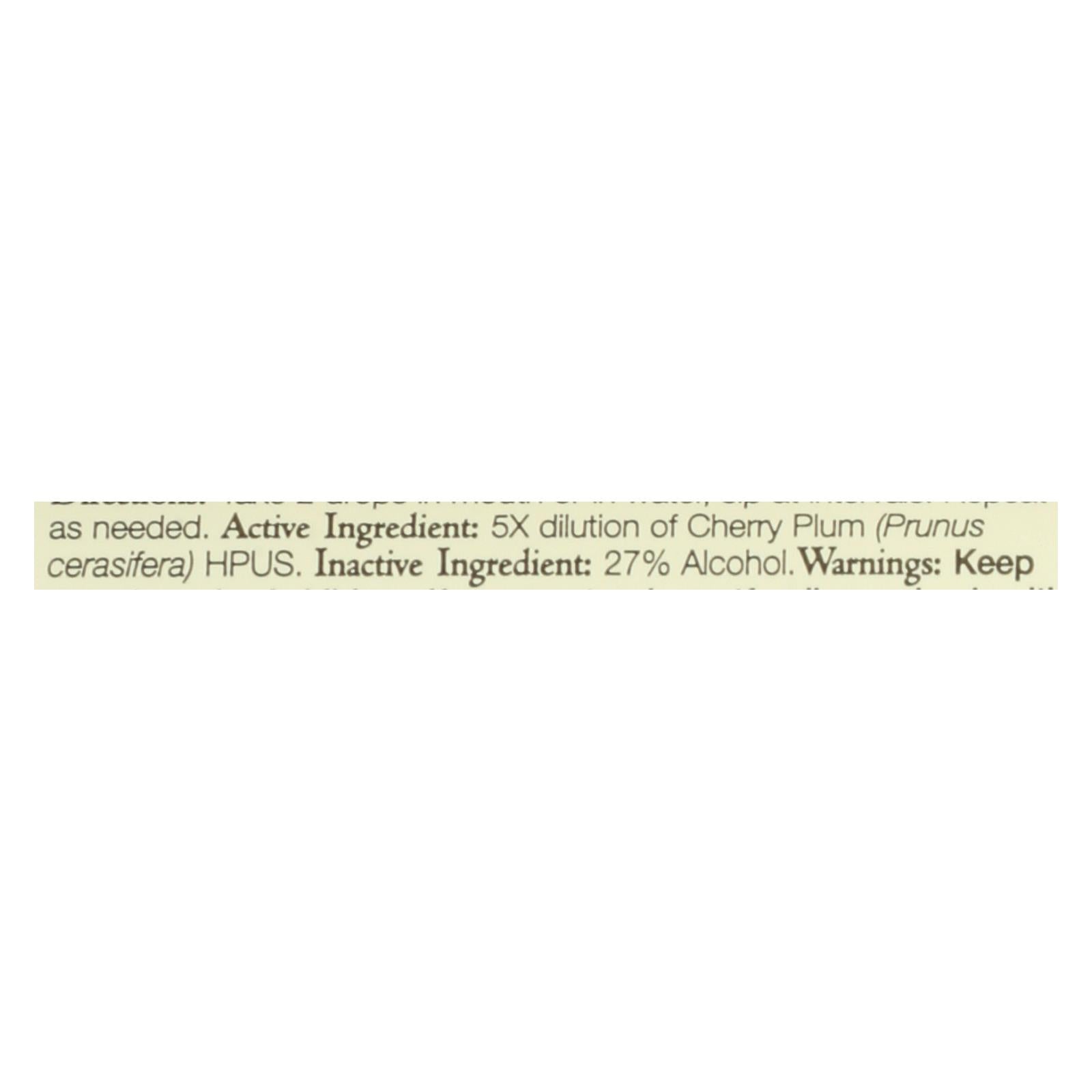 Bach cherry plum original flower remedy is for relief of naturally occurring simple nervous tension. Each 20 ml. Bottle of our homeopathic cherry plum original flower remedy contains a 5x dilution of cherry plum hpus and the inactive ingredient of 27% alcohol. See the product label for all usage and warning information.