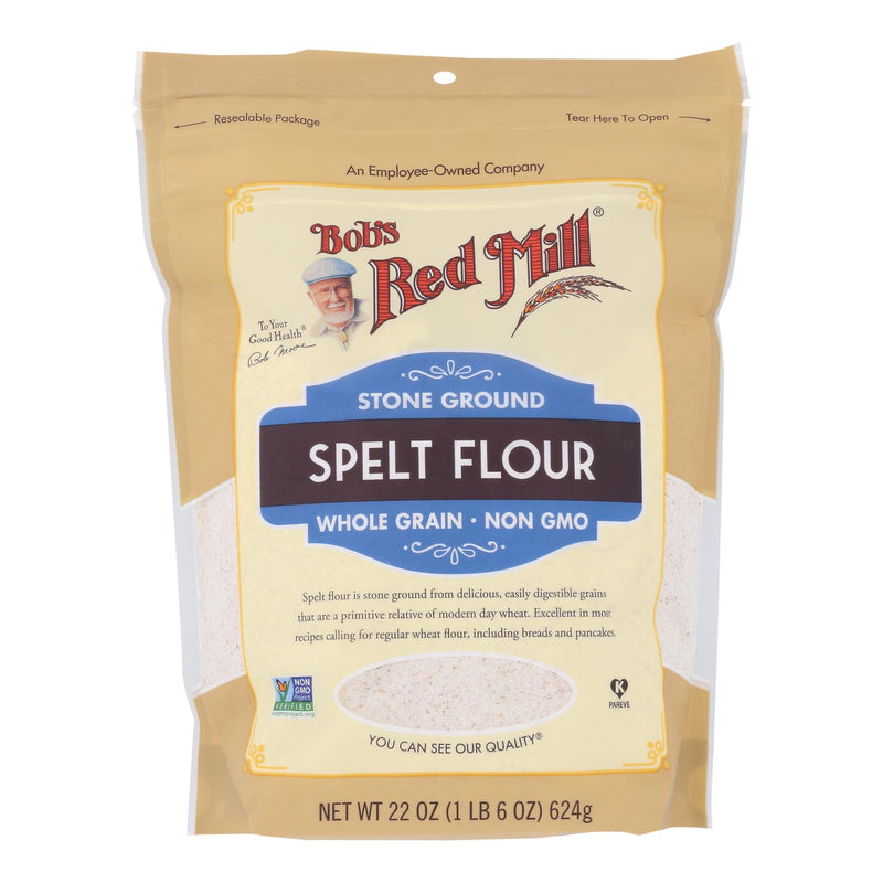 Whole grain. Non gmo. Non gmo project verified. Nongmoproject.org. An employee-owned company. To your good health. Spelt flour is stone ground from delicious, easily digestible grains that are a primitive relative of modern day wheat. Excellent in most recipes calling for regular wheat flour, including breads and pancakes. You can see our quality. Dear friends, at bob's red mill, we take great pleasure in bringing wholesome foods like whole grain spelt flour to your table. We search the world for unique and unusual heirloom grains that you can use to forge new culinary adventures - right in your own kitchen! rely on us for a wide variety of baking flours, grains and mixes you'll feel good about eating. To your good health, - bob moore. Bobsredmill.com. For information and recipes, visit bobsredmill.com resealable package.