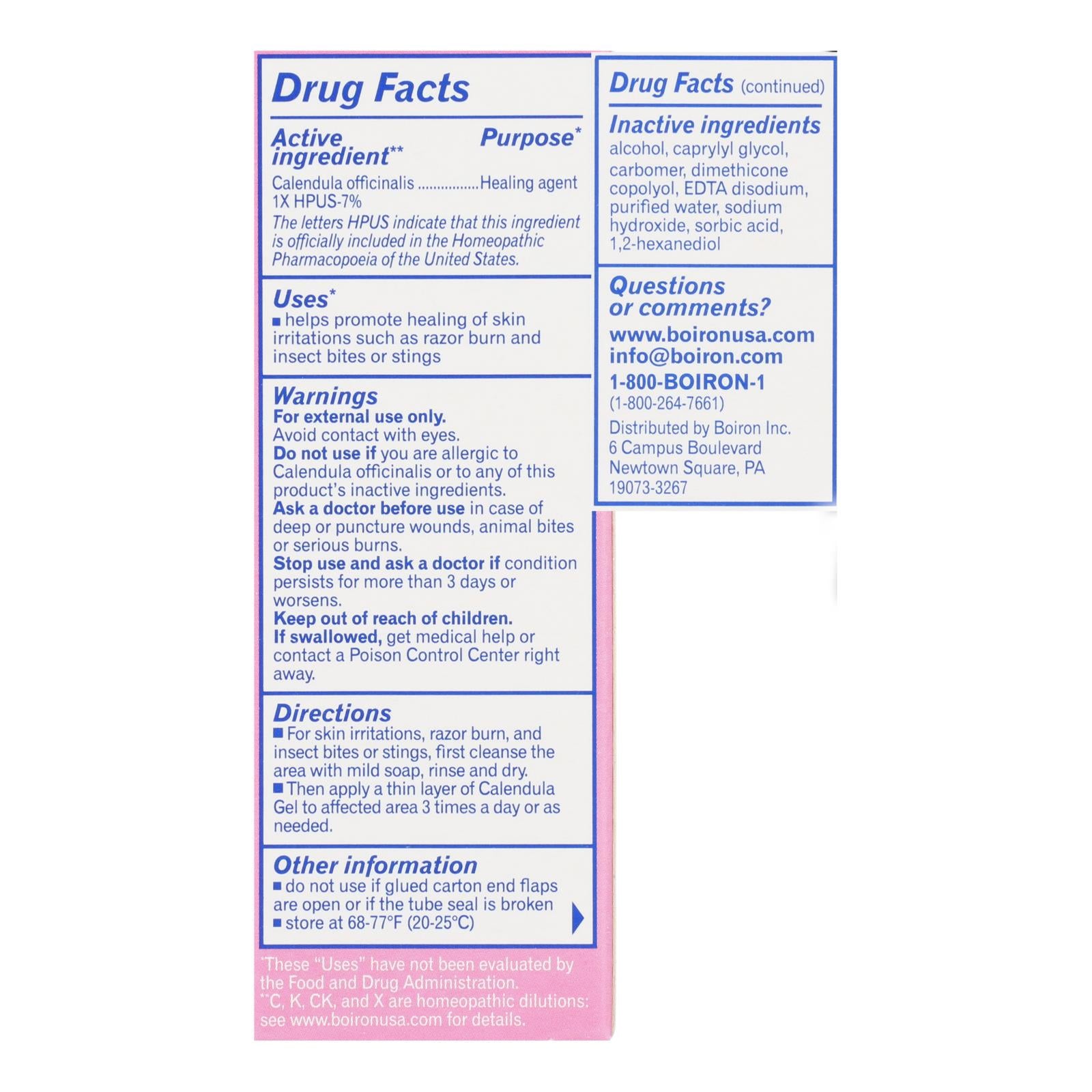 Boiron calendula gel, first aid is a powerful gel for use in minor first aid care. Made primarily from naturally derived ingredients, boiron topical calendula gel, first aid is largely free of unnatural and unnecessary additives. This product is homeopathic and does not contain parabens. Each box of boiron topical calendula gel, first aid weighs 1.5 oz. See label for warnings.