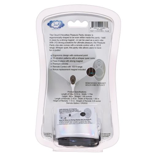Cloud 9 Panty Pleasures Magnetic Panty Vibe Plum Purple from Cloud Nine Novelties. Wearable Vibe. Remote control. Panty not included. The Cloud 9 Novelties Pleasure Panty vibrator is ergonomically shaped to be worn either inside the panty: held in place by a strong magnet or can be used as a palm vibe. With 10 strong pulsations for ultimate pleasure, the Pleasure Panty vibe also comes with a remote control with a 100 feet range. Whisper quiet, this panty vibe allows users to have fun in public!