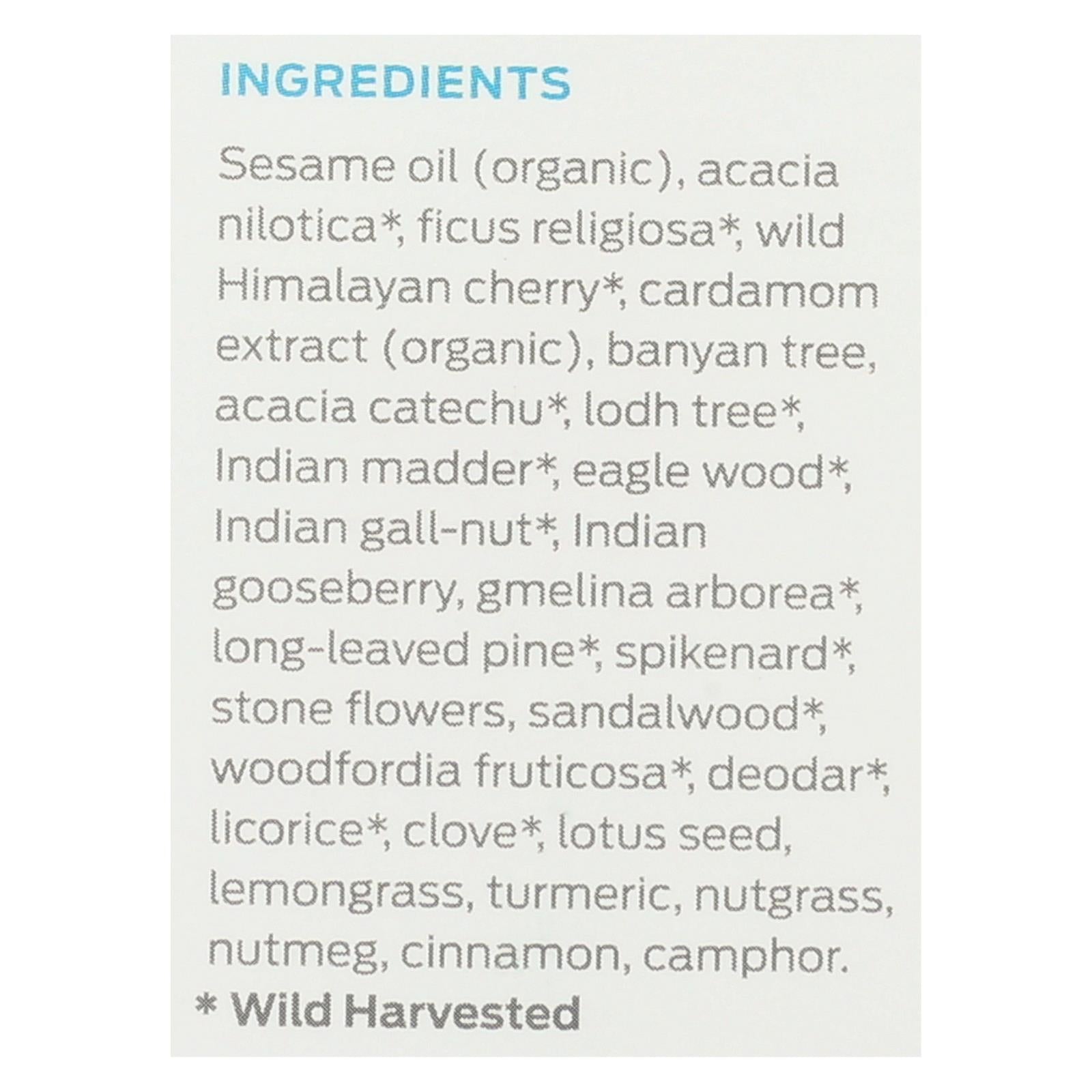 ingredients : sesame oil;organic;acacia nilotica;ficus religiosa;wild himalayan cherry;cardamom extract;banyan tree;acacia catechu;lodh tree;indian madder;eagle wood;indian gall-nut;indian gooseberry;gmelina arborea;long-leaved pine;spikenard;stone flowers;sandalwood;woodfordia fruticosa;deodar;licorice;clove;lotus seed;lemongrass;turmeric;nutgrass;nutmeg;cinnamon;camphor