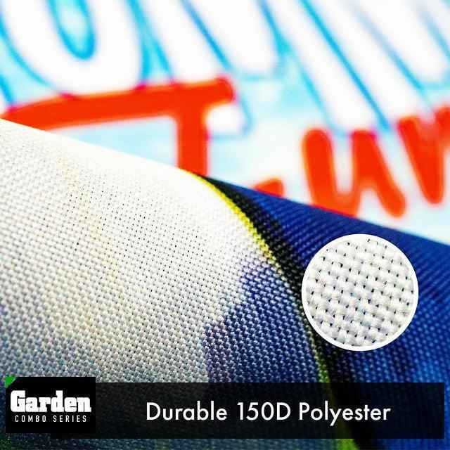 - SPECS: Garden Flag Stand is 36" x 16" after assembly from black iron 3 piece set; Summer Fun with Cat in Pool flag is a 12"x18" size vertical polyester garden flag. Imported, 100% Polyester Flag