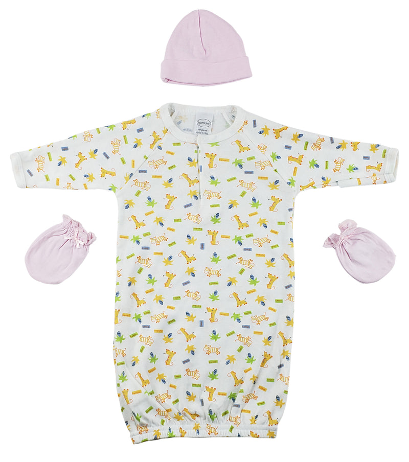 Unisex Print Gown (100% Cotton), Pink Infant Mittens (Jersey), Pink Baby Cap (100% Cotton)