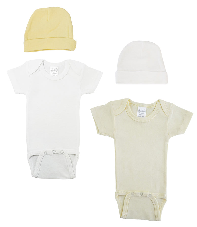 Short Sleeve Onezie Bodysuits (100% Cotton), Yellow Short Sleeve Onezies (100% Cotton), Yellow Baby Cap (100% Cotton), White Baby Cap (100% Cotton)