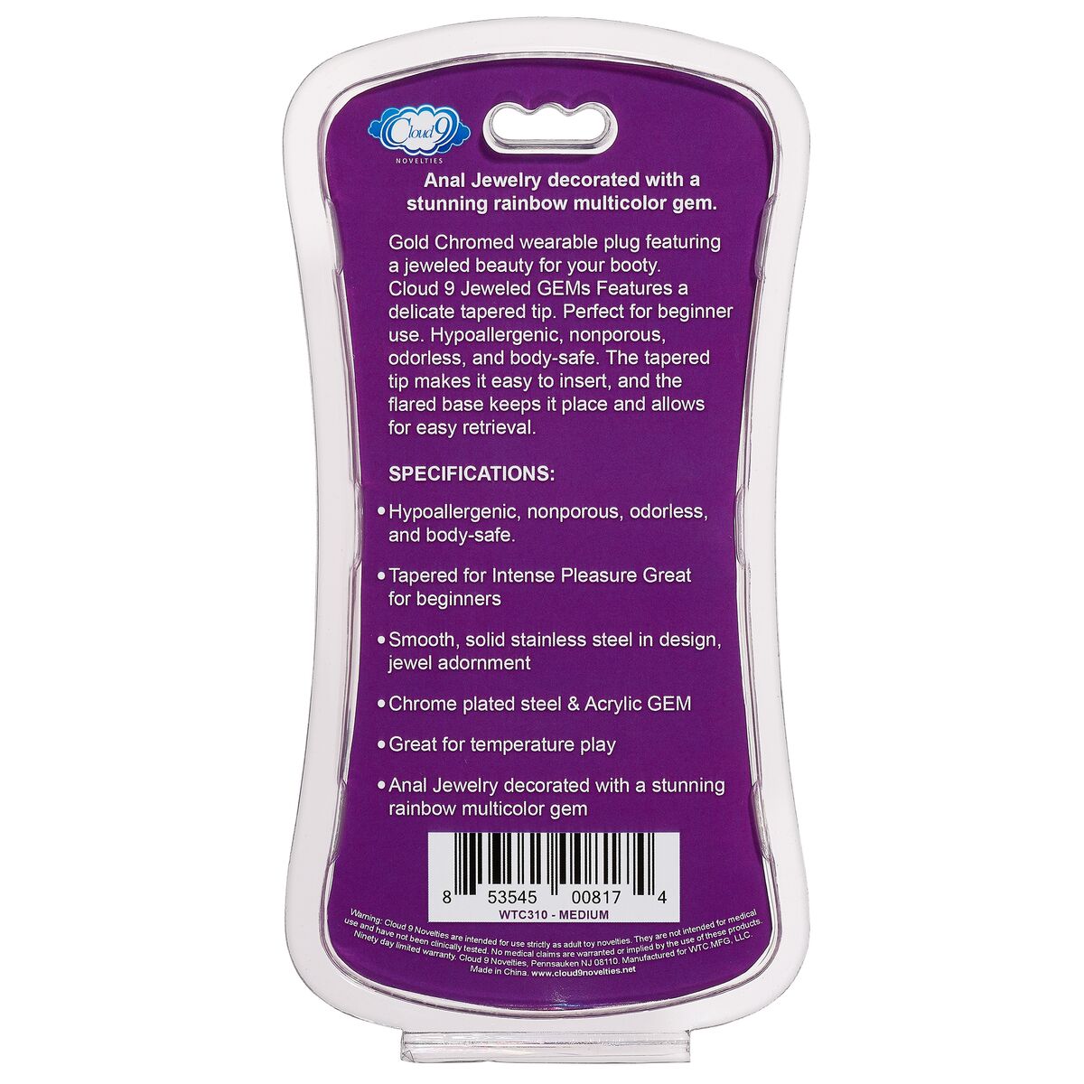 Cloud 9 Gems Gold Anal Plug . Anal Jewelry decorated with a stunning rainbow multicolor gem. Gold Chromed wearable stainless steel plug featuring a jeweled beauty for your booty. Cloud 9 Jeweled Gems