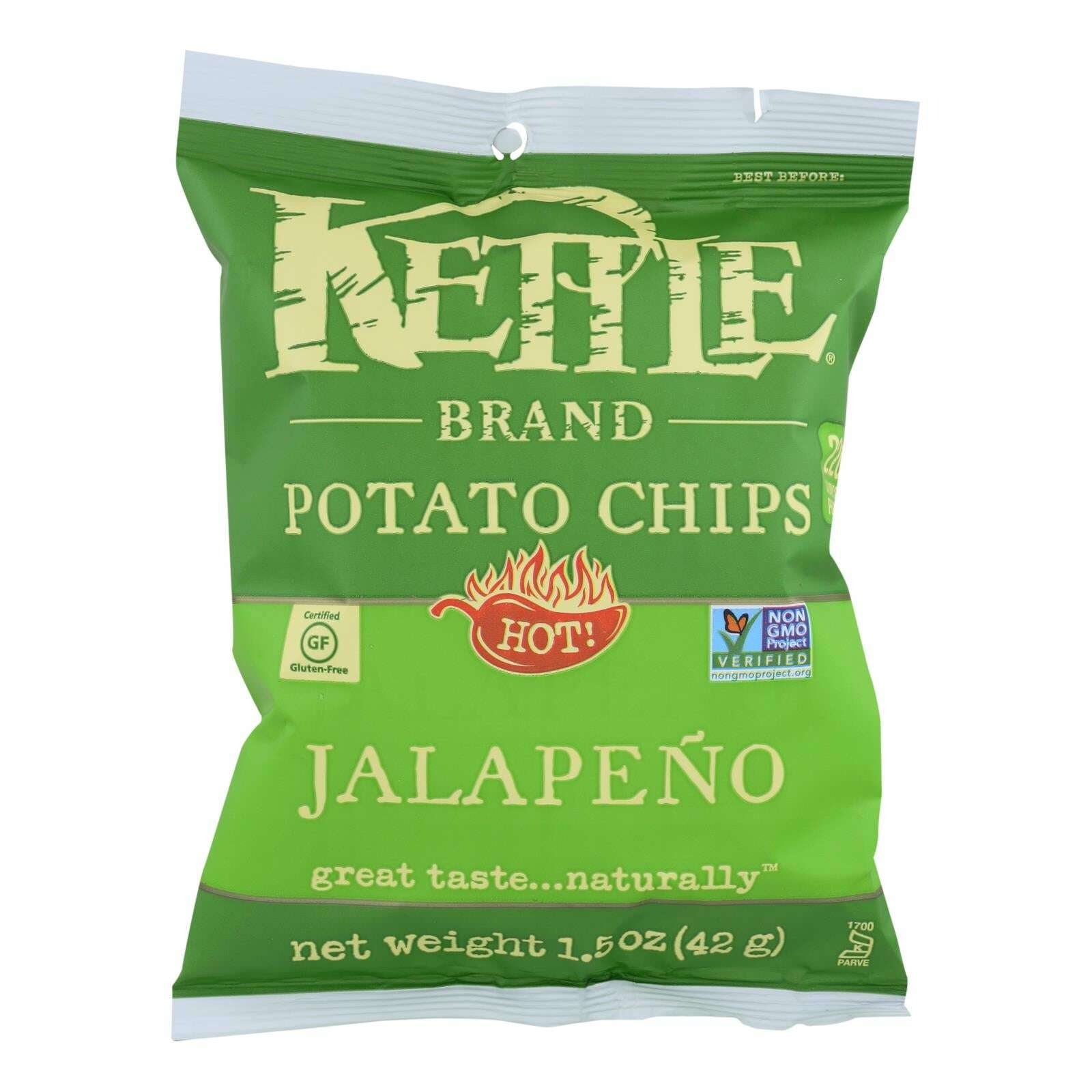 Kettle brand jalapeno potato chips brings a spicy flavor to your lips with just one bite. This 1.5 oz. Bag of potato chips is the perfect option for a midday snack when you're craving a salty, yet spicy flavor-filled treat. The rich blend of potatoes, garlic powder and jalapeno powder offers a zesty flavor you can't resist.