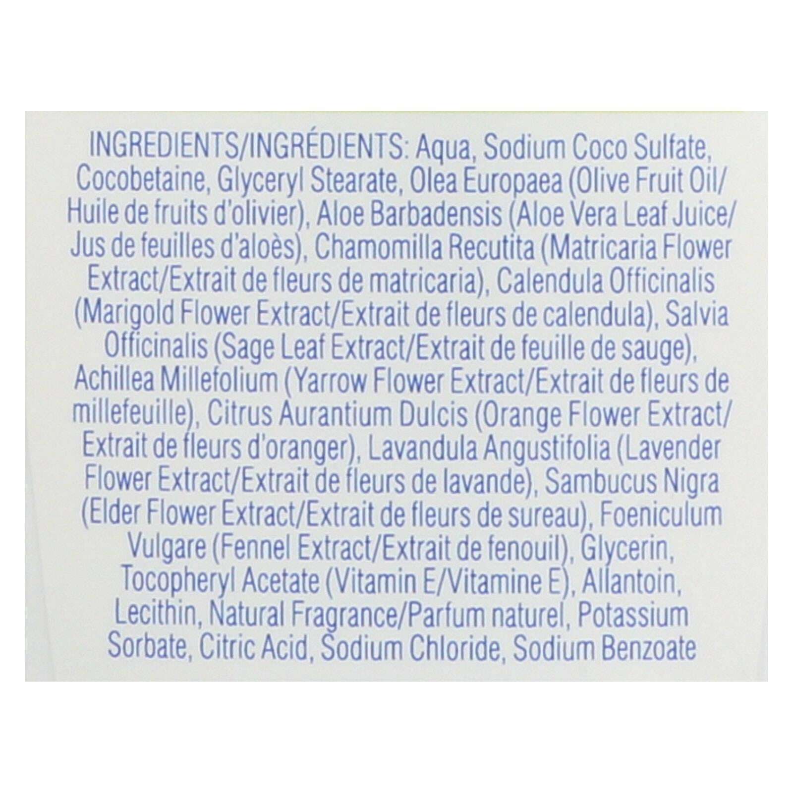 ingredients : aqua;sodium coco sulfate;cocobetaine;glyceryl stearate;olea europaea;olive fruit oil;aloe barbadensis;aloe vera leaf juice;chamomilla recutita;matricaria flower extract;calendula officinalis;marigold flower extract;salvia officinalis;sage leaf extract;achillea millefolium;yarrow flower extract;citrus aurantium dulcis;orange flower extract;lavandula angustifolia;lavender flower extract;sambucus nigra;elder flower extract;foeniculum vulgare;fennel extract;glycerin;tocopheryl acetate;vitamin e;alla