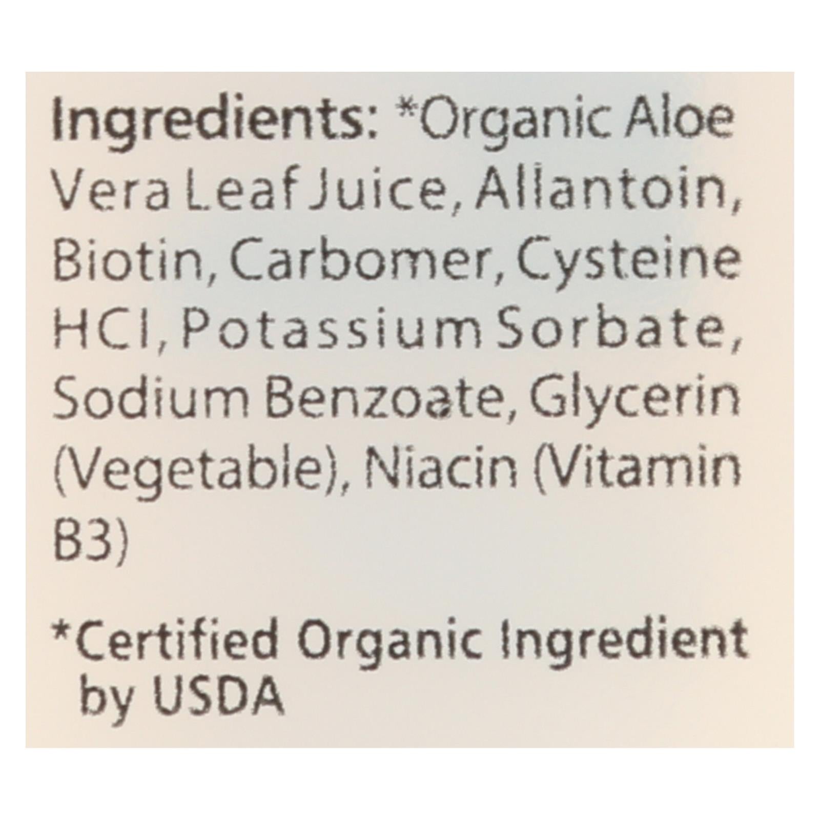 ingredients : organic aloe vera leaf juice;allantoin;biotin;carbomer;cysteine hcl;potassium sorbate;sodium benzoate;glycerin;vegetable;niacin;vitamin b3