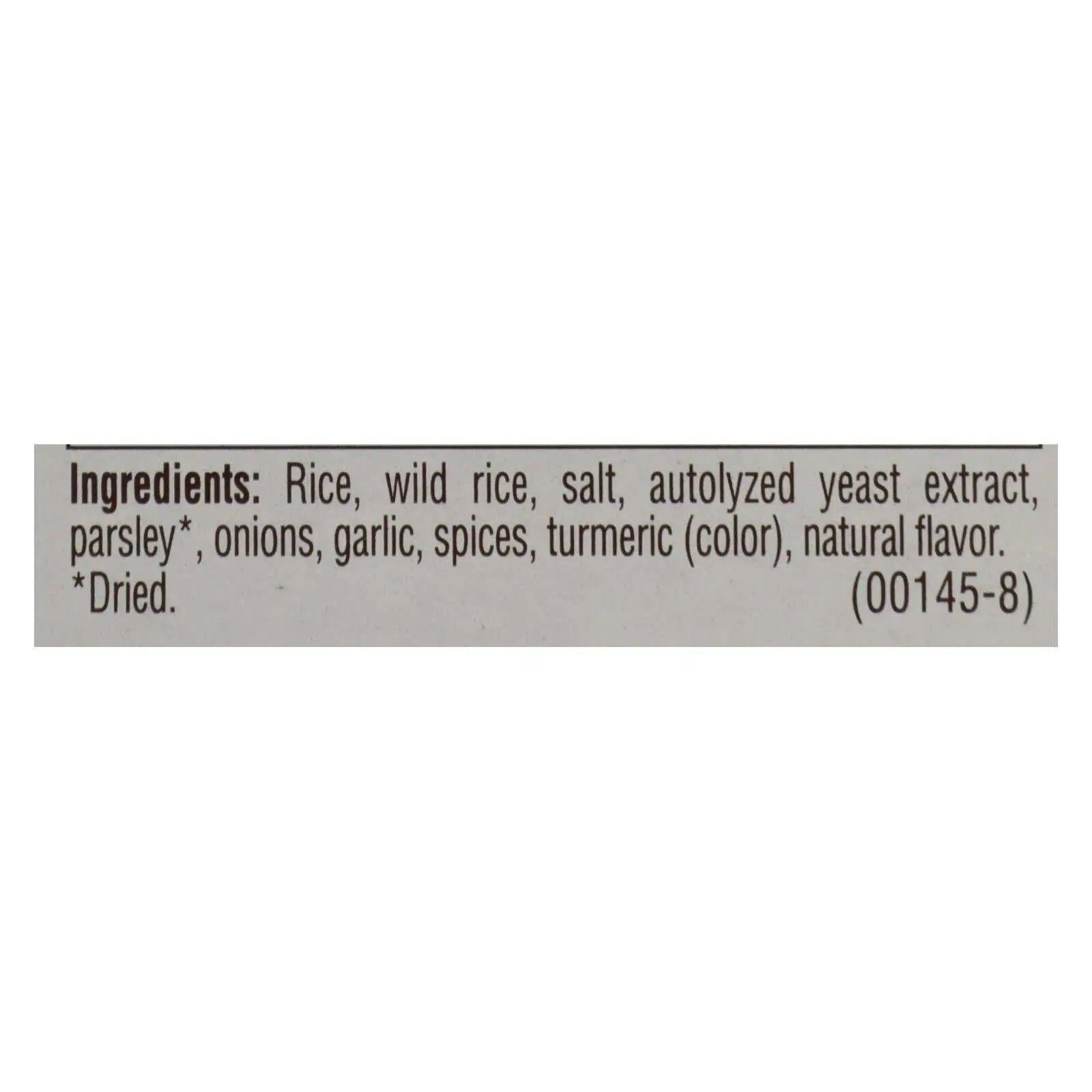 ingredients : rice;wild rice;salt;autolyzed yeast extract;parsley;onions;garlic;spices;turmeric;color;natural flavor