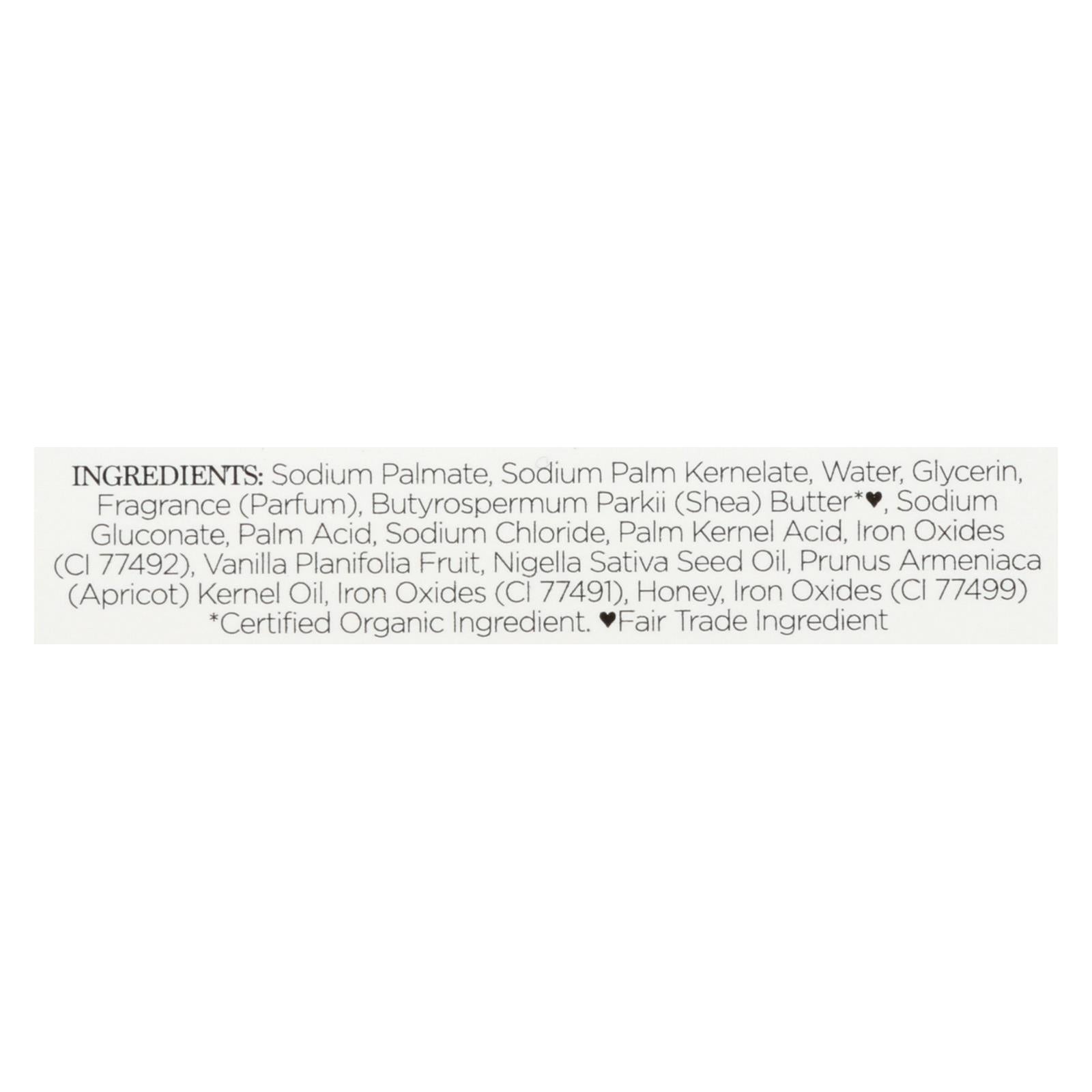 ingredients : sodium palmate;sodium palm kernelate;water;glycerin;fragrance;parfum;butyrospermum parkii;shea;butter*♥;sodium gluconate;palm acid;sodium chloride;palm kernel acid;iron oxides;ci 77492;vanilla planifolia fruit;nigella sativa seed oil;prunus armeniaca;apricot;kernel oil;ci 77491;honey;ci 77499