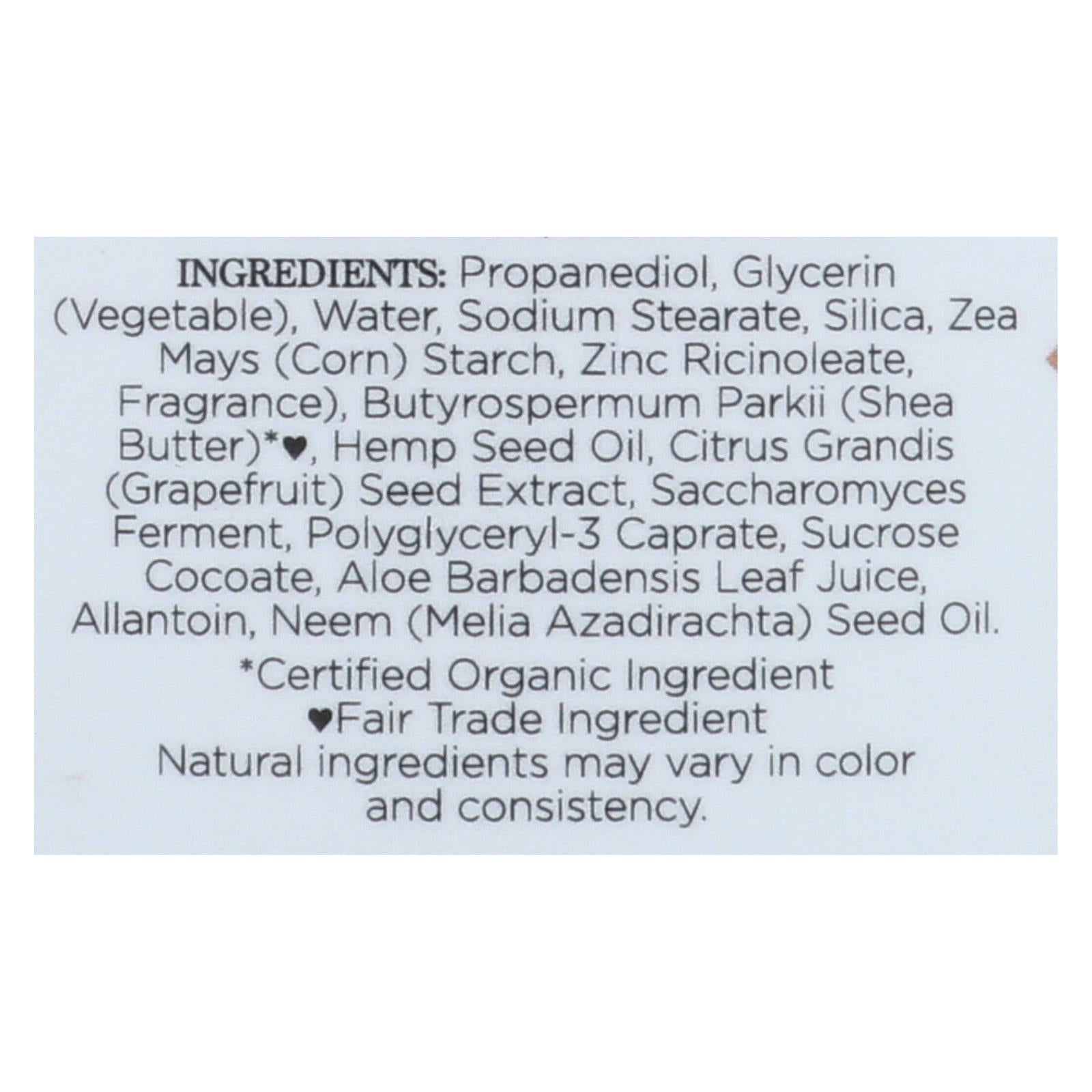 ingredients : propanediol;glycerin;vegetable;water;sodium stearate;silica;zea mays;corn;starch;zinc ricinoleate;fragrance;butyrospermum parkii;shea butter;•;hemp seed oil;citrus grandis;grapefruit;seed extract;saccharomyces ferment;polyglyceryl-3 caprate;sucrose cocoate;aloe barbadensis leaf juice;allantoin;neem;melia azadirachta;seed oil