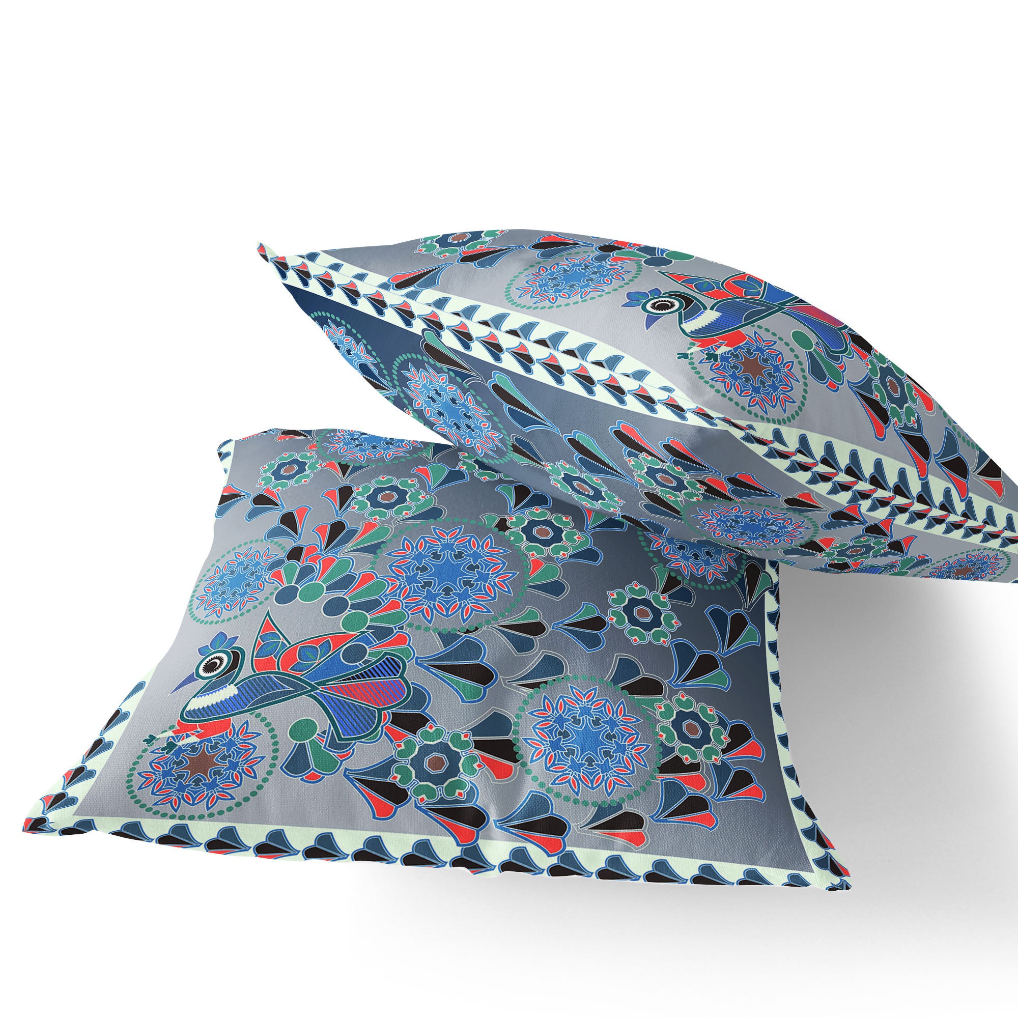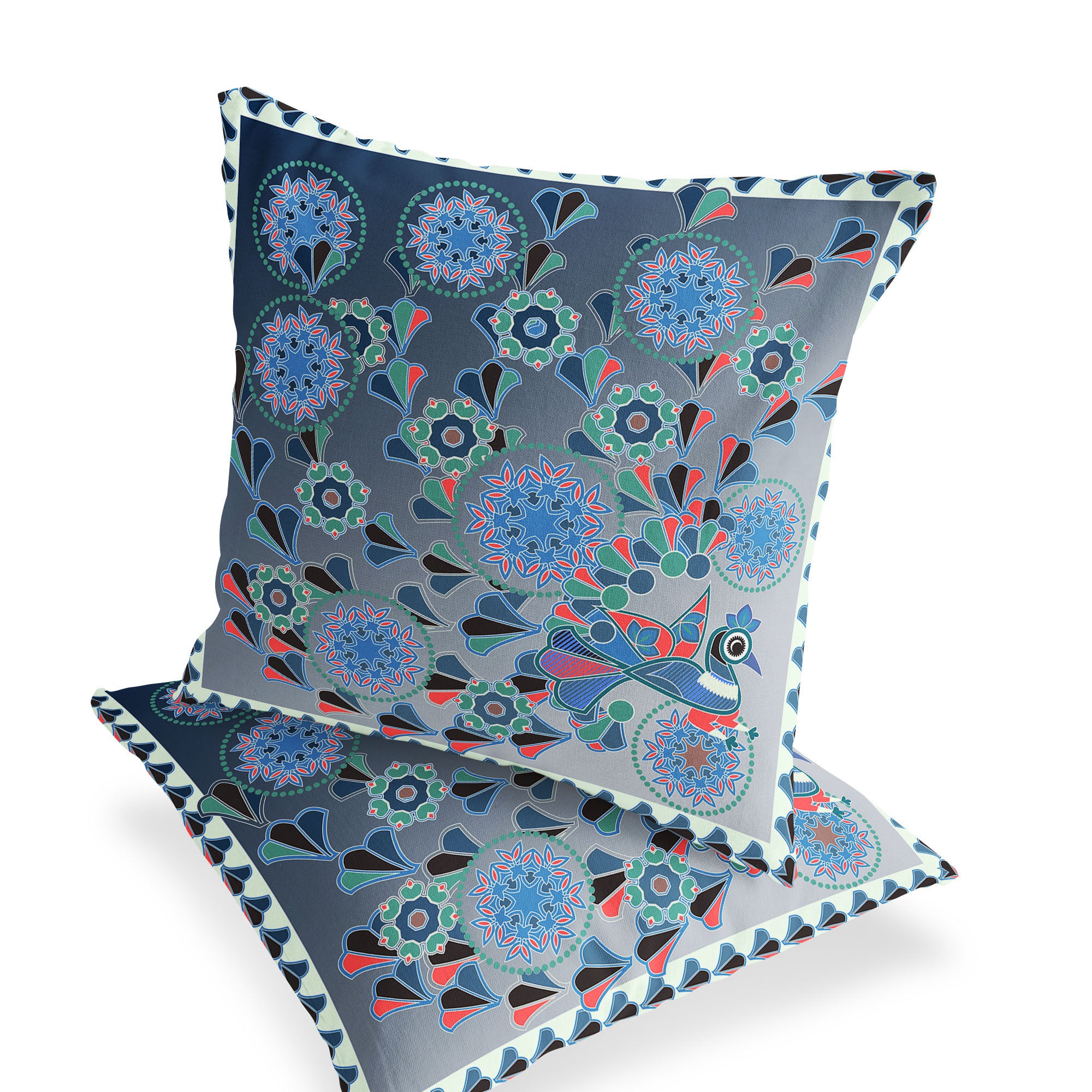Set of Two 16" X 16" Blue and White Peacock Blown Seam Floral Indoor Outdoor Throw Pillow