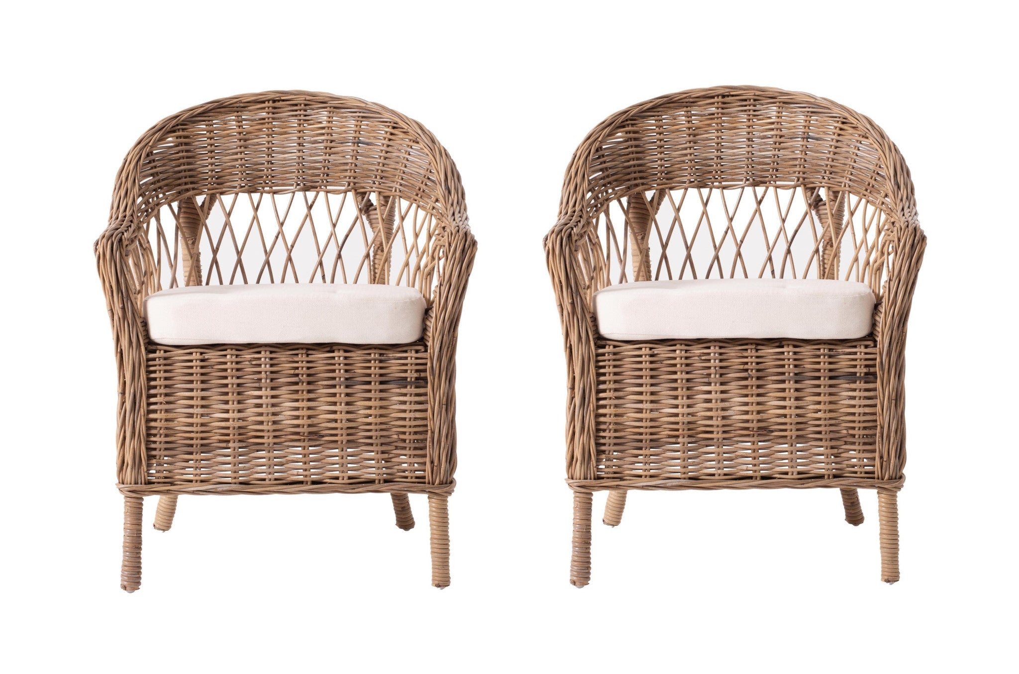 Bring lush texture to any of your home design styles may it be boho, traditional, modern, or contemporary style, with this Set of Two Semi Circle Back Wicker Arm Chairs with Seat Cushion. Visually having natural materials in your home is shown to increase your mood and vibe. Handcrafted from rattan, these sturdy and good looking chairs are a great casually elegant way to set your space. Each comes with a thick, neutral, creamy white soft cushion, made from 100% cotton, for a cozy and inviting feel. 35.43-inch H x 26.77-inch W x 26.77-inch D