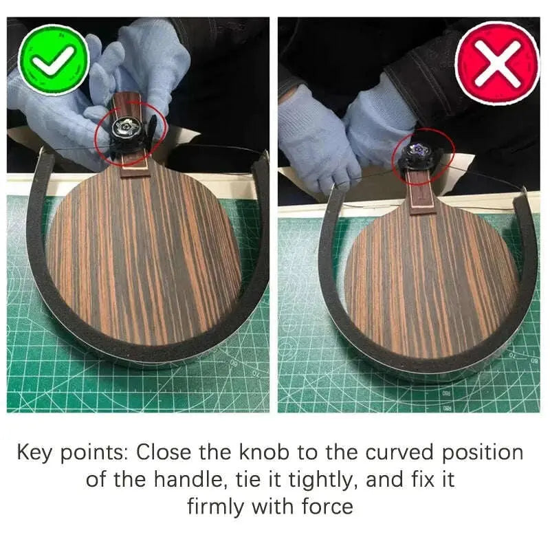 Installing the Blade: Hook the bow strings on both sides of the bow blade around the racket handle, ensuring the rotating buckle faces upward. Fit the bow blade onto the outer edge of the blade and secure the rotating buckle (the buckle should be installed at the junction of the handle and the blade).