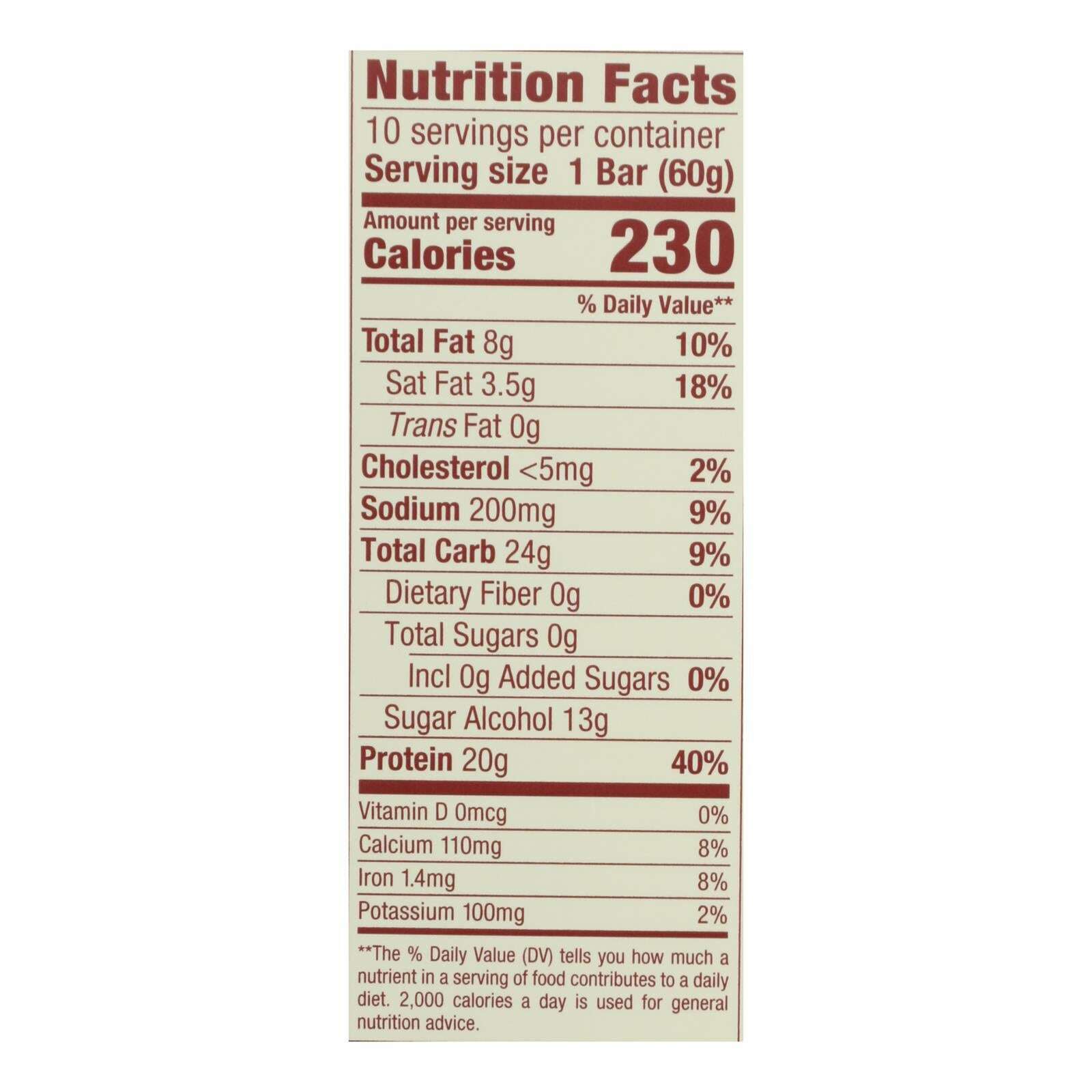 ingredients : protein blend (soy protein isolate, whey protein isolate, calcium caseinate, whey protein concentrate);maltitol syrup;vegetable glycerin;almond butter;water;palm kernel oil;sunflower oil;natural flavor;lecithin;tapioca starch;salt