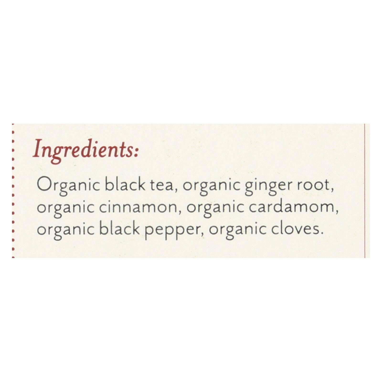 ingredients : organic black tea;organic ginger root;organic cinnamon;organic cardamom;organic black pepper;organic cloves