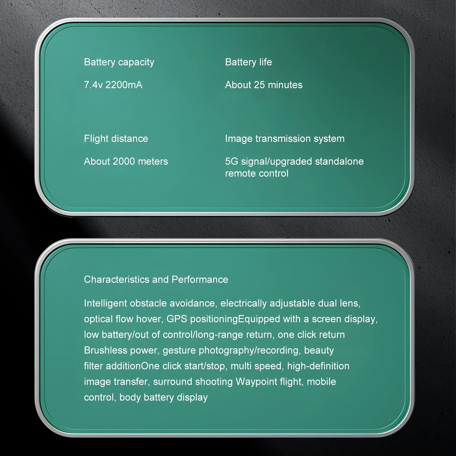 Front lens placed 4K HD WIFI, bottom HD WIFI with optical flow can be switched to take pictures of the angle, accurate positioning, ultra-long battery life 3.7V large battery, low battery / out of control / over distance can be returned to the flight, intelligent follow, flying around the point, double folding (wind blade, wing), APP cell phone control, customized routes, a key to return to the flight, rise and fall, forward and backward, left and right side flight, headless mode, automatic switching of optical flow / GPS