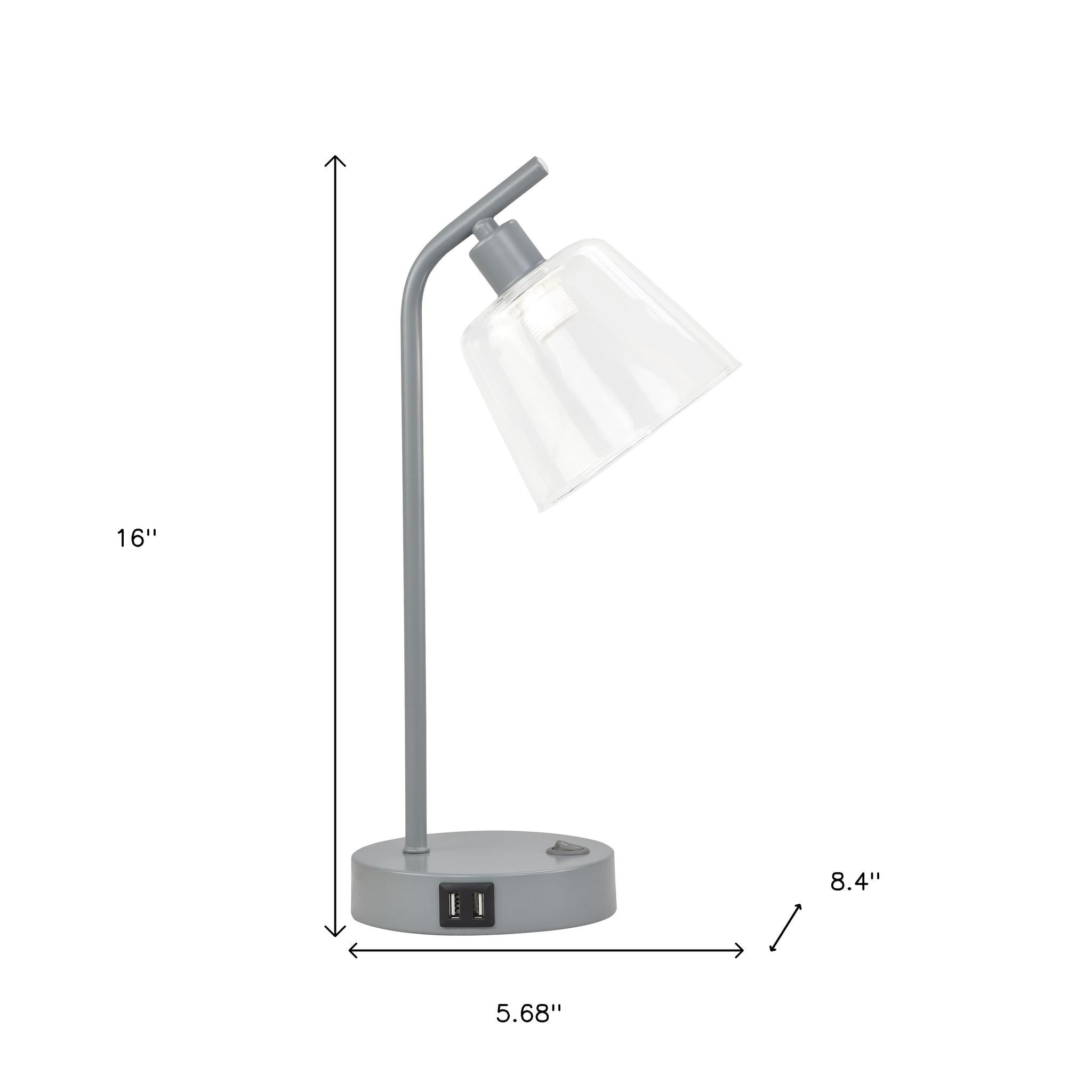 16" Gray Metal USB Table Lamp With Clear Globe Shade