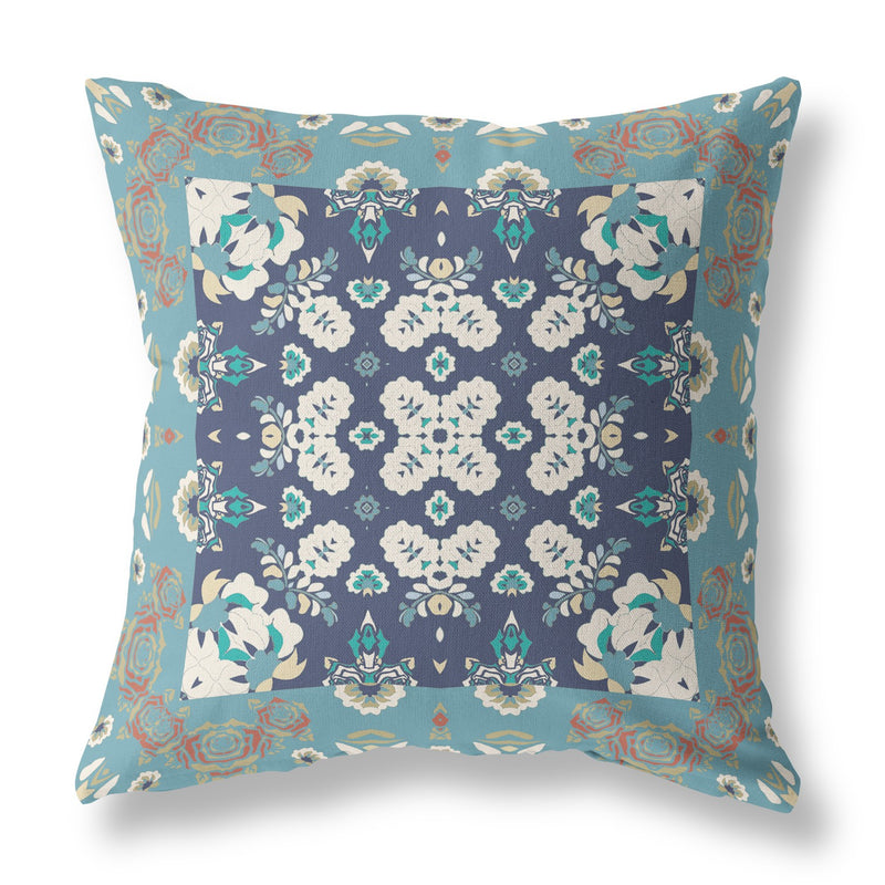 16" X 16" Gray And Blue Floral Blown Seam Suede Throw Pillow