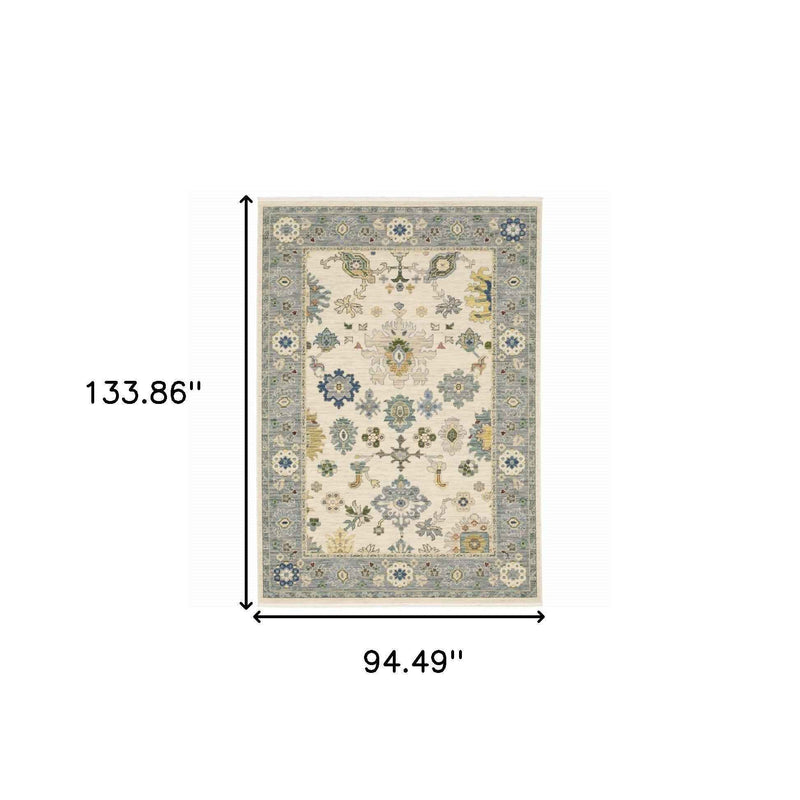 8' X 11' Ivory Blue Grey Teal Gold Green And Rust Oriental Power Loom Stain Resistant Area Rug With Fringe