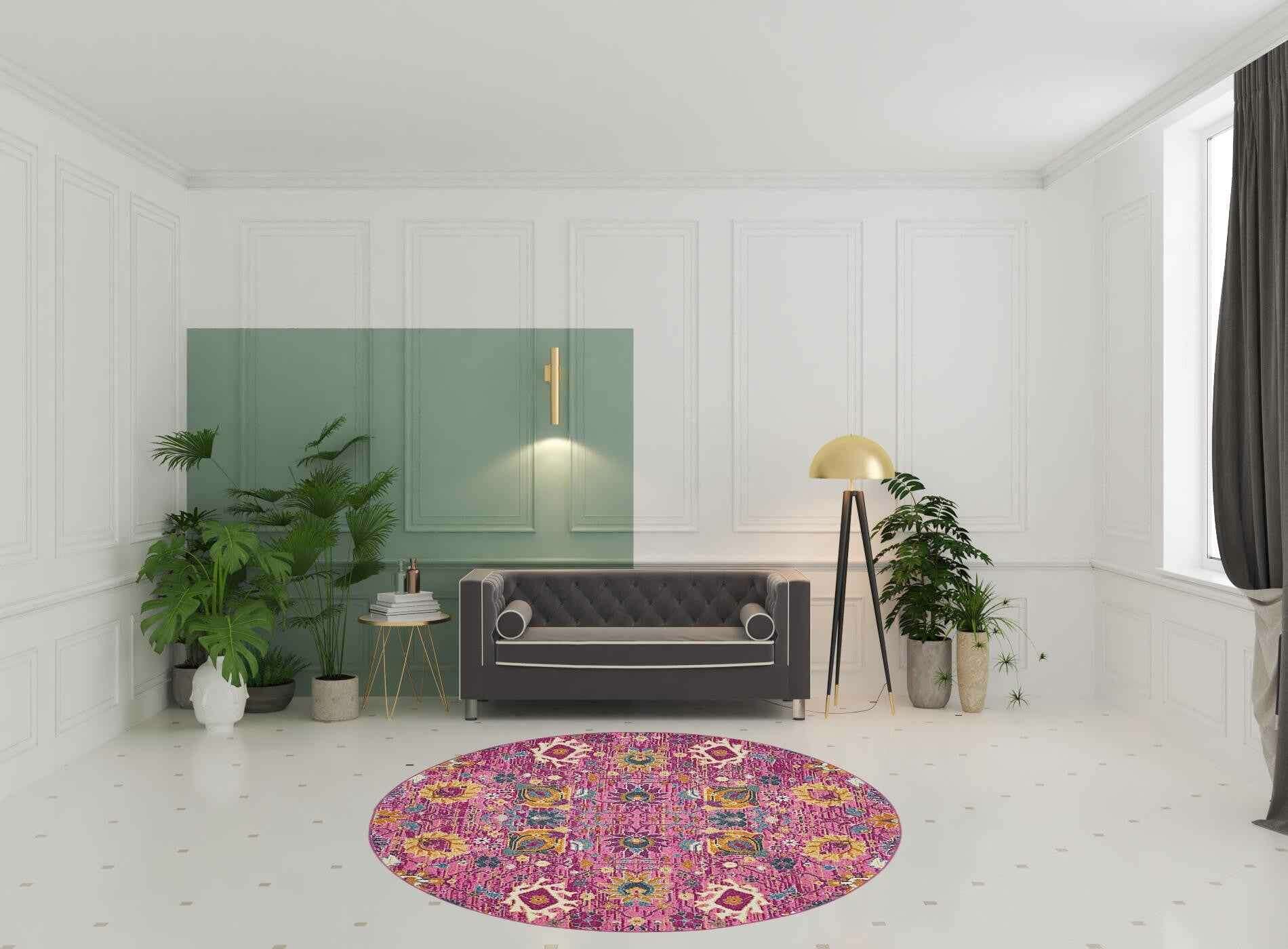 This 8' pink round floral power loom area rug, is a great way to add warmth to a room. This geometric round shaped rug features a floral pattern in pink that combines a good looking print with a unique and updated shape. The mix of shape, color, and design gives this rug refreshing visual interest. Made in Turkey, this rug offers high quality combined with good looking designer sensibilities. Place this area rug against a hardwood or tile floor and it will enliven your living space with style and sophistication. .50" H x 96.00" W x 96.00" D