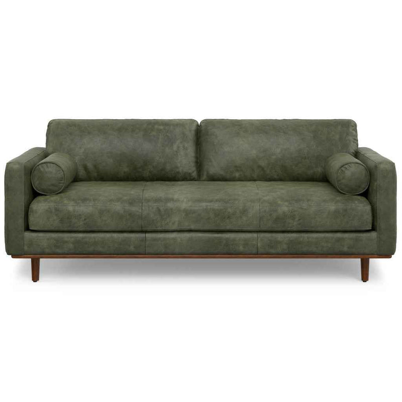 89" Moss Green Leather Sofa With Brown Legs