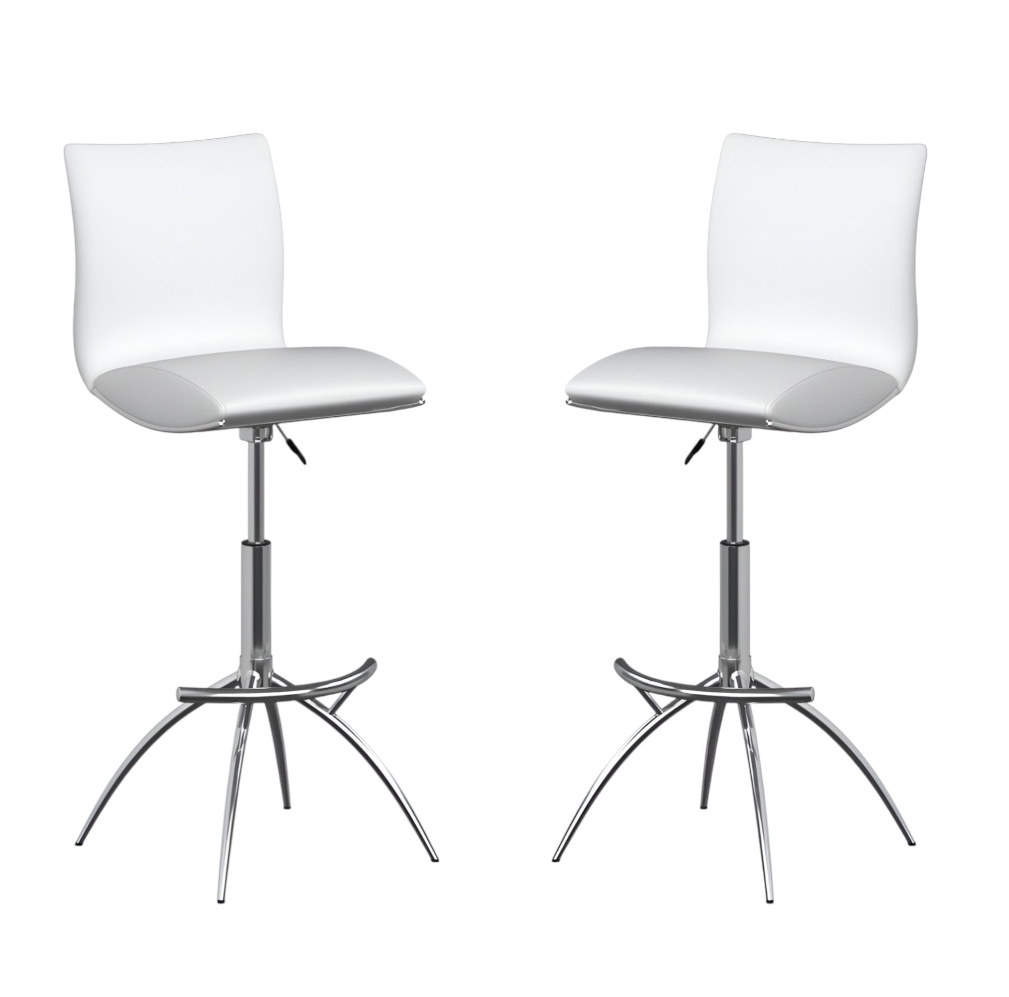 Set of Two White and Silver Faux Leather and Metal Low Back Adjustable Height Bar Chairs