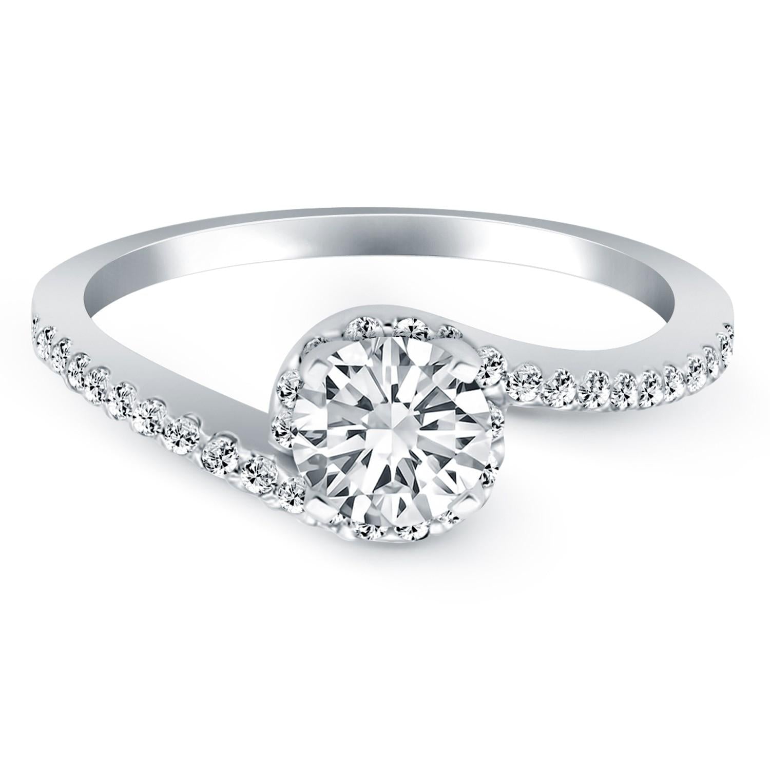 14k White Gold Bypass Swirl Diamond Halo Engagement Ring
