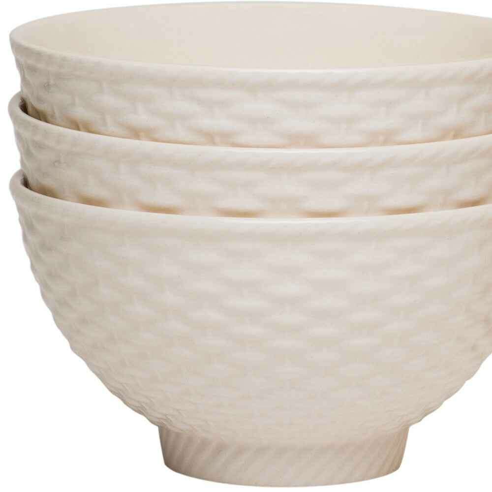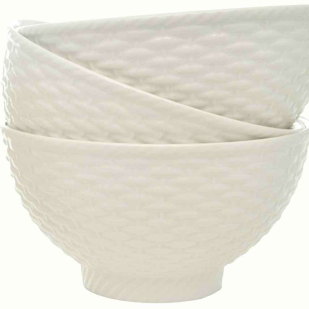 This white four piece weave stoneware service for four bowl set is the perfect addition to your dining collection. Made of durable and chip-resistant stoneware, this set includes four dessert bowls that are both microwave and dishwasher safe. With a stylish cottage design and a stackable feature, these bowls are not only functional but also aesthetically pleasing. Whether you're serving delicious desserts or using them for everyday meals, this set is sure to impress your guests. The set is designed with convenience in mind, as it is easy to clean and store. Upgrade your dinnerware collection with this versatile and high-quality bowl set. 3-inch H x 5.5-inch W x 5.5-inch D