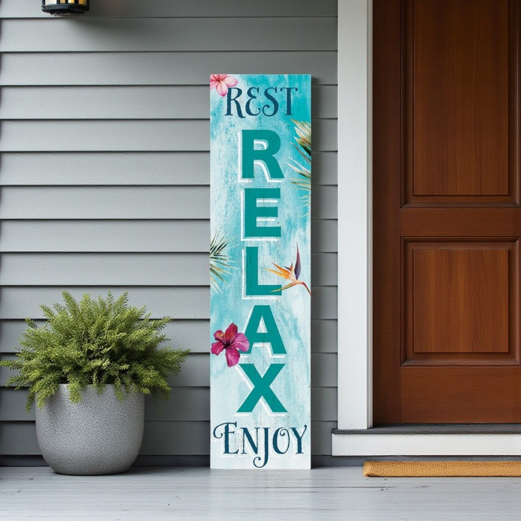 10" Aquamarine And Pink Solid Wood Tropical Floral Rest Relax Enjoy Porch Sign