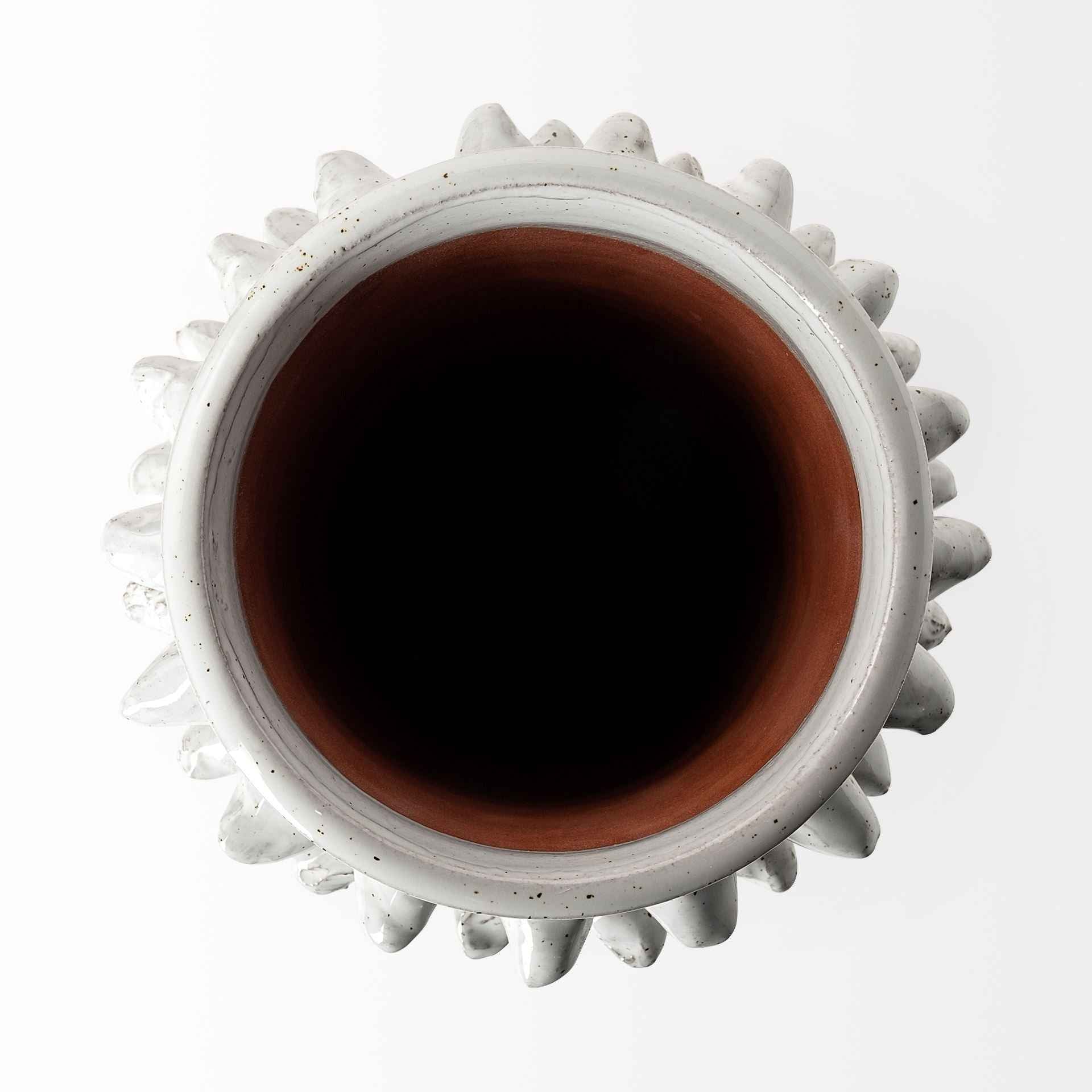 A unique decor piece, this Organic Style Whitewash Spikely Ceramic Vase will add a touch of whimsy to any space in your home. The vase is made from ceramic and has an organically speckled white glaze on it. The cylindrical shape has a rounded base with the inside left in a natural terra cotta brown color. Around the top edge of this vase there are two lines of 3D spokes that jet out of the vase. These spikes are rounded and not sharp at the edges adding a great element of depth to the overall look of the vase. You can use this vase on its own or you can display floral arrangements, live or artificial, in it. 11" H x 6" W x 6" D